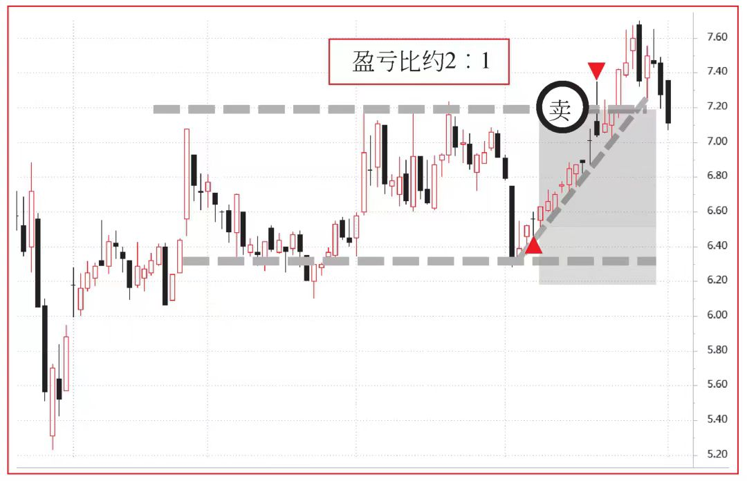 信号K线后等待了一天,随后的第二天买进。如图7所示,这是一根跳空小阳线(对应从左到右第二个红色三角形),突破了调整之后的下跌趋势线,显示出上涨动能充足,这是一个好的标志。