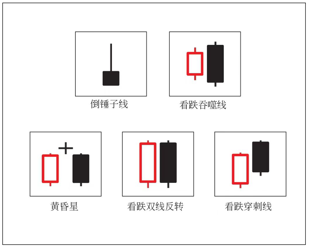 (2)多转空逆转信号K线。其包括倒锤子线、看跌吞噬线、黄昏星、看跌双线反转和看跌穿刺线。如图8所示,多转空逆转信号K线技术原理与看多一样,不赘述。