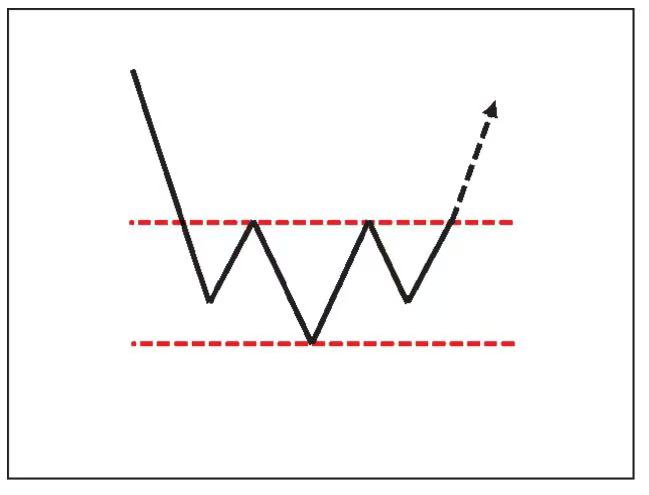 如图3所示,三重底有三个大致相等的底部。两次反弹和第二次、第三次下跌的幅度相等,反弹高点的连线是颈线。一些交易者认为,相对于双底,三重底两次测试了支撑线,可以主观判断为更牢固的底部。