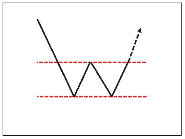 如图2所示,双底也称为W底。形态由两次下跌、一次反弹以及测试成功后的突破构成。依据反弹高点画的水平线是颈线。两次下跌形成两个低点(底),第二个底可以高于、约等于或是小幅低于第一个底。双底的技术特征是通过第二次下跌,验证了第一个底有明确的支撑效应。