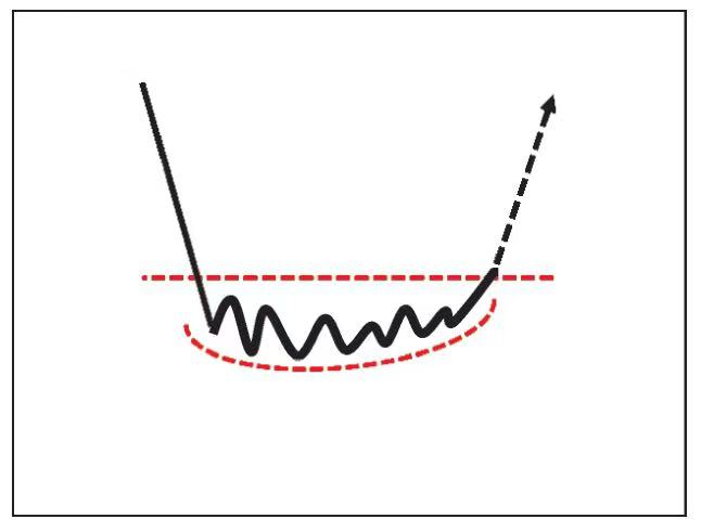 如图4所示,圆弧底是长期下跌后,跌幅趋缓,价格窄幅运动。随着时间的推移,价格不再创新低,并缓慢抬高,盘势上呈现圆弧状。以左侧圆弧开始的位置画水平线作为颈线,当价格突破颈线后,通常会大幅上涨。圆弧底的技术特征是长期的价格窄幅运动。