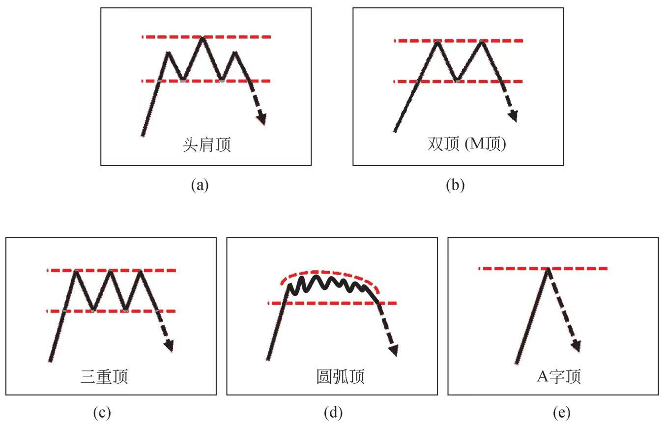 (2)顶部形态。从上涨趋势的尾声到新的下跌趋势开始,整个过程属于顶部形态。相对于底部形态,顶部形态的价格波动速度会更快,幅度也更大。如图6所示,顶部形态的多数技术特征,大致对应底部形态,在此不赘述。