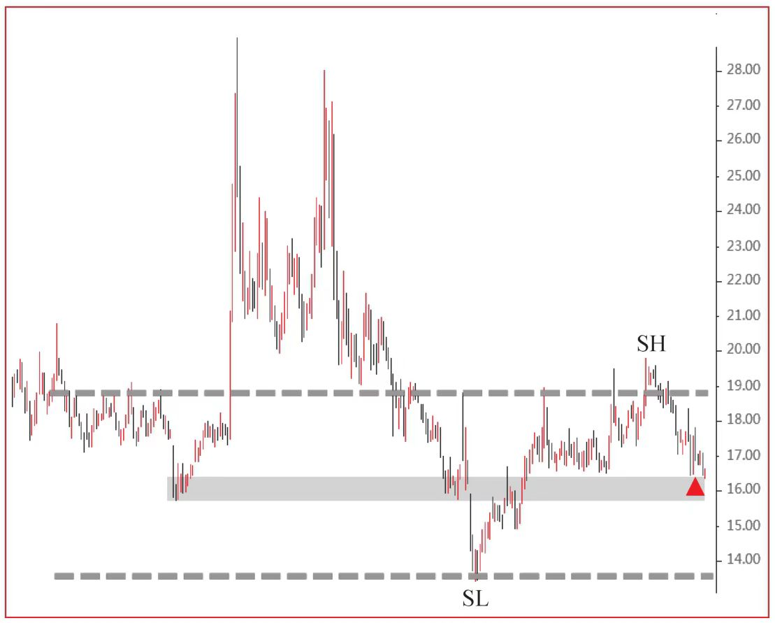 如图3所示,交易者首先要从最后一根K线(对应红色三角形)出发,找出最近的摆动低点(Swing Low, SL)和摆动高点(Swing High, SH),并在图中标注。