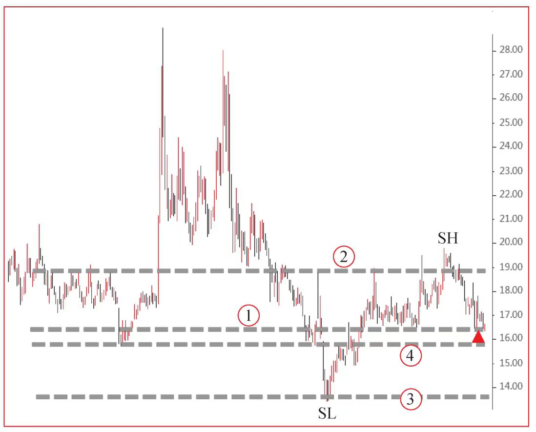 第三,根据SL,画出③号水平线。由于图2中没有更多的历史K线,所以这条线是大型下跌趋势(从图中最高点)是否持续的标志。如果出现新低,就是下跌趋势持续。