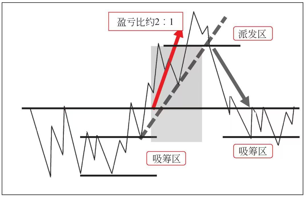 参看图1,区间运动的支撑线买、阻力线卖,做的是区间内的一次摆动。在图2中,突破吸筹区买,从摆动的中间顺势进场,做的是摆动的后半段。在图3中,交易者认为突破吸筹区,是一段大型摆动的起始点,试图把握一段大型摆动。