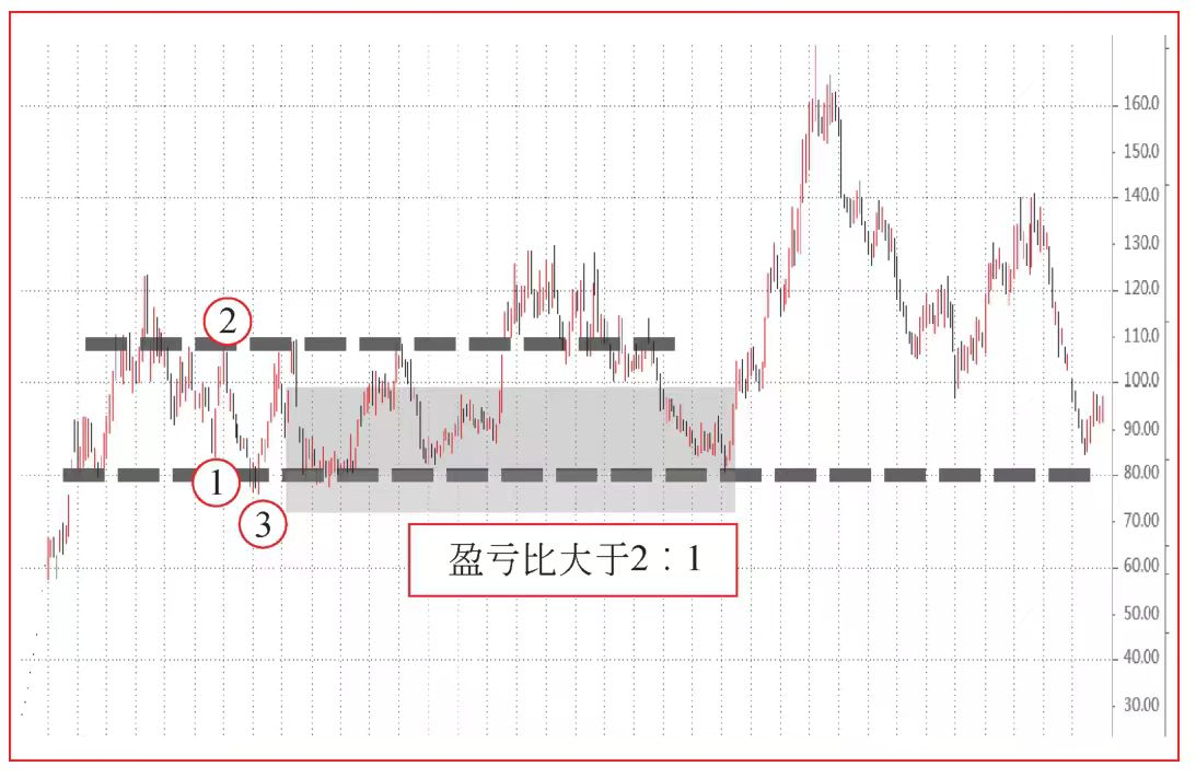 如图1所示,左下角是上涨,因此按照①②③确认区间结构后,就确定了主区间的两条水平线。右侧是下跌,大幅下跌后按照①②③确定区间结构。在这个区间,支撑线是先前的阻力线,属于关键水平线;阻力线②③没有选择两个红色三角形,原因就是以红色三角形做②③确定主区间结构,盈亏比不够2。