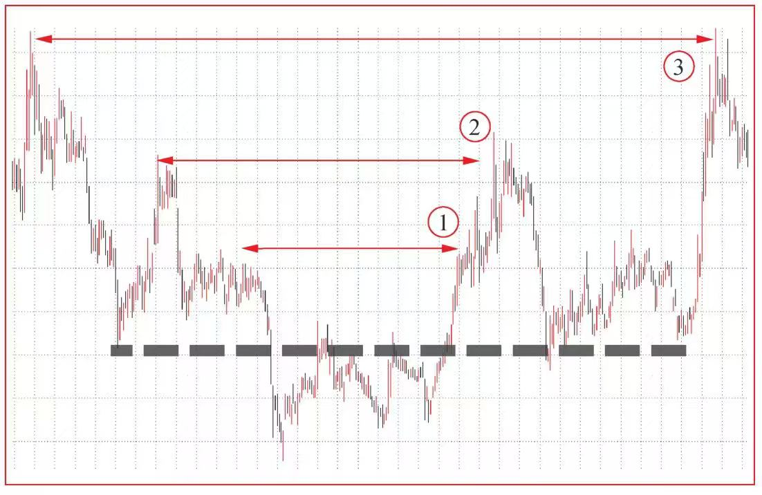 (1)左侧高点的阻力作用。如图1所示,将左侧的高点和右侧的临时性顶部两点连线,就会画出一根水平线,成为小型的阻力线。在区间结构的内部运动中,价格运行到左侧高点附近的时候,通常会成为阻力,形成临时性的顶部。