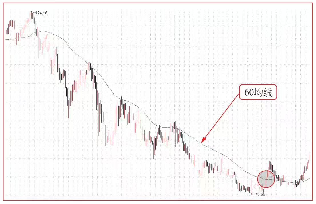 (2)均线。60均线是裸K线交易者跟踪长期趋势的少数工具之一,适用于所有时间周期。将图3中的下降趋势改用60均线来分析,如图4所示。当60均线走平后向下拐头,意味着下跌趋势确立。之后,在整个下跌趋势中,60均线清晰地表明了趋势的方向,并表现出磁吸效应和阻力作用。在价格多次触及60均线,并突破之后,是趋势结构可能结束的重要信号。