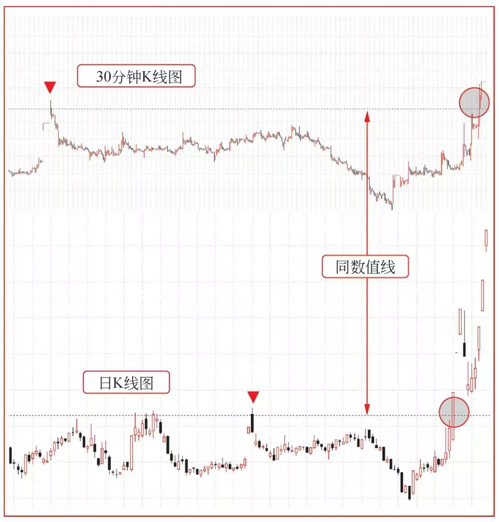 在图2中,上面是30分钟K线图,下面是日K线图。虚线表示的阻力线价位在两个时间周期上是相同的。在代表同一时刻的红色三角形与圆圈之间,30分钟K线图的K线更密集,数量远多于日K线图。