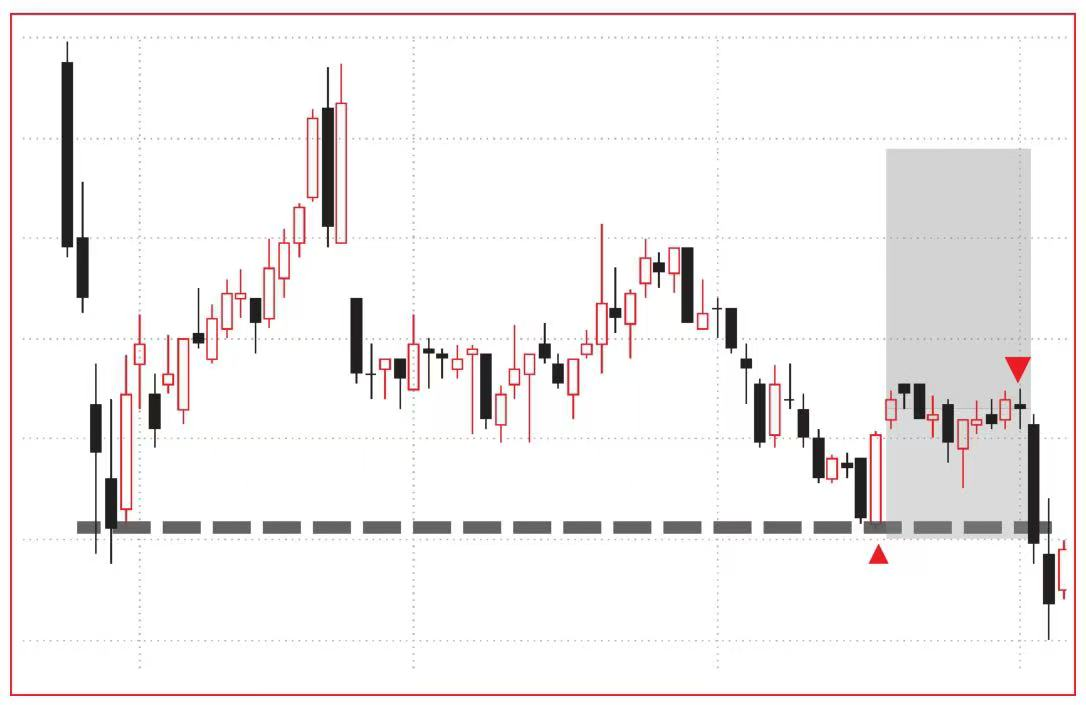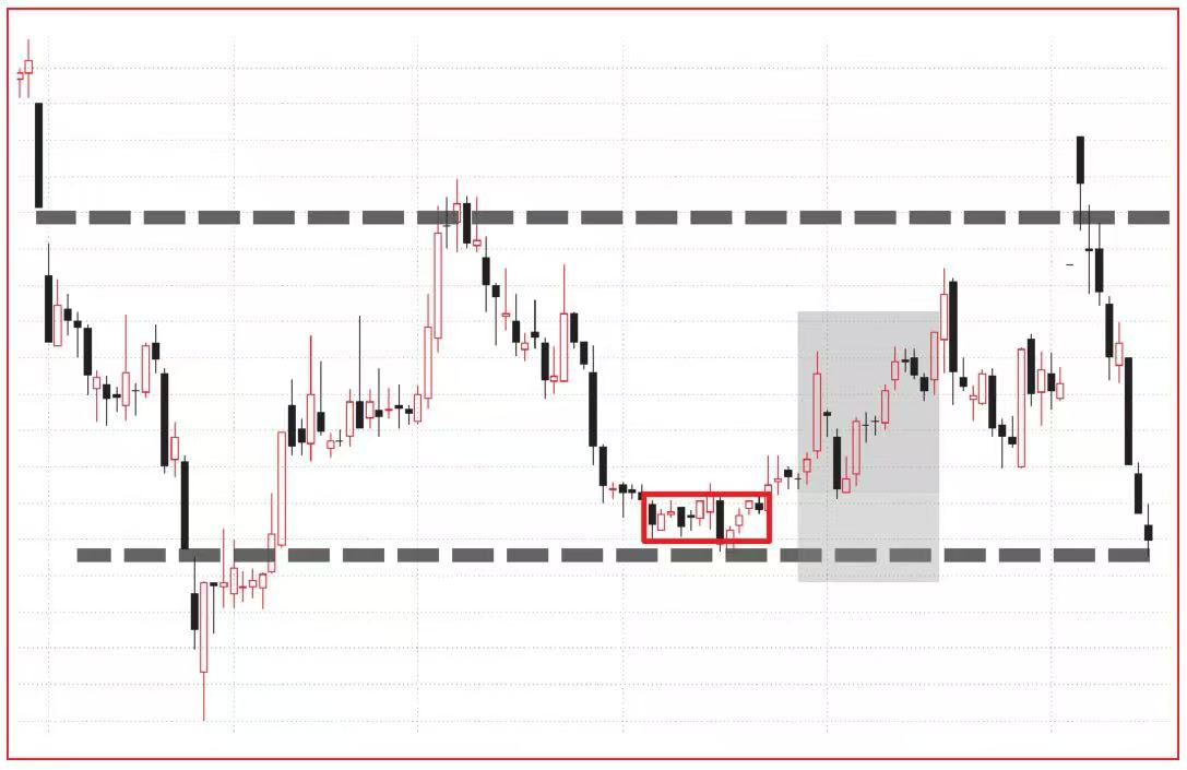如图1所示,价格跌到支撑线附近的时候,并没有出现典型的逆转信号K线,而是在靠近支撑线上方呈现窄幅收敛的价格行为。交易者把窄幅收敛作为进场的小型价格区间,并以区间上沿作为进场价格,评估潜在的盈亏比。如果潜在的盈亏比大于2,则可以在窄幅收敛区内分批买进。