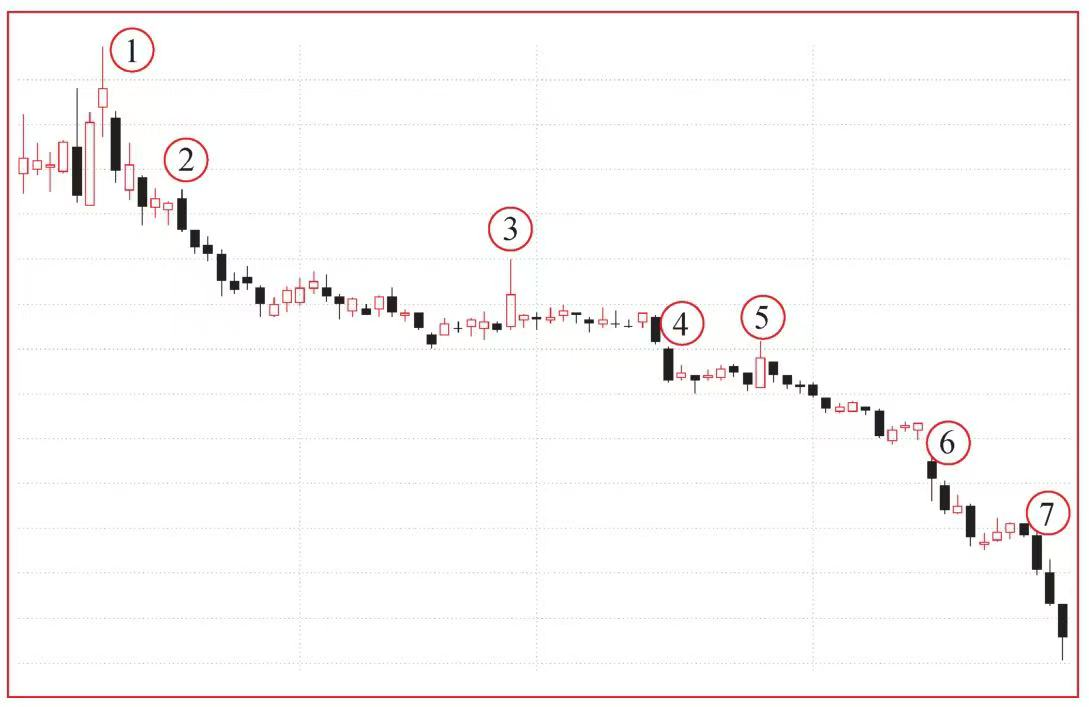 如图2所示,案例中的下跌阶段,顺趋势方向做交易就是主动卖空,信号K线主要有以下两种情形。