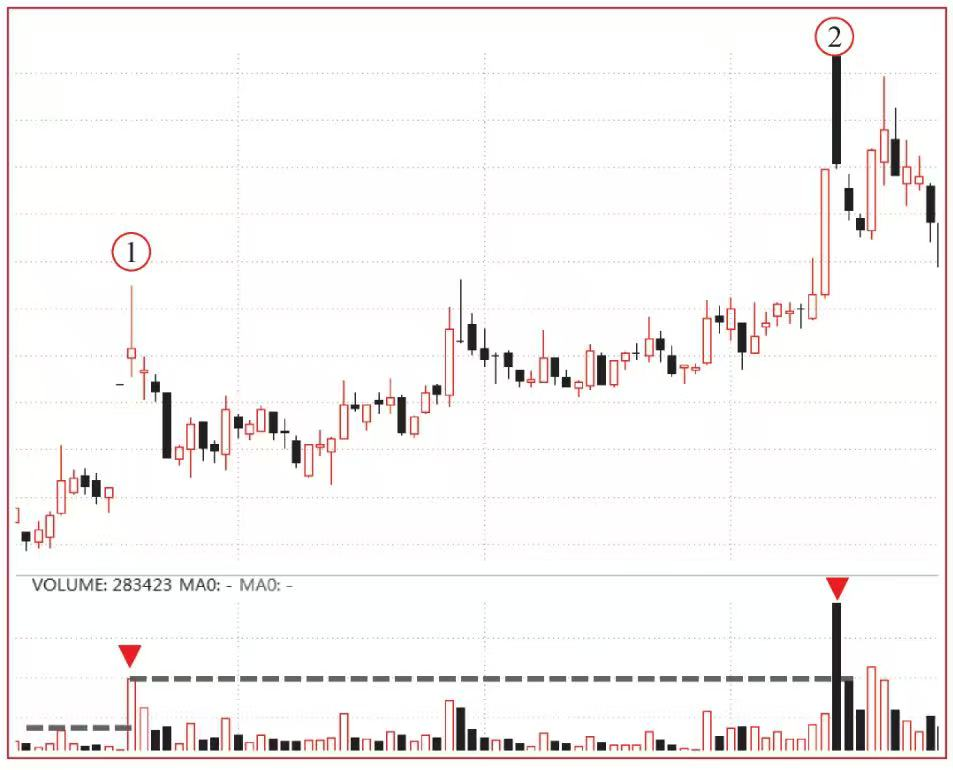 如果巨大的成交量伴随典型的逆转信号K线,如图1所示,①的看跌Pinbar和②的高位大阴线,通常是做多策略的危险信号,那么裸K线交易者一般会主动卖出离场。