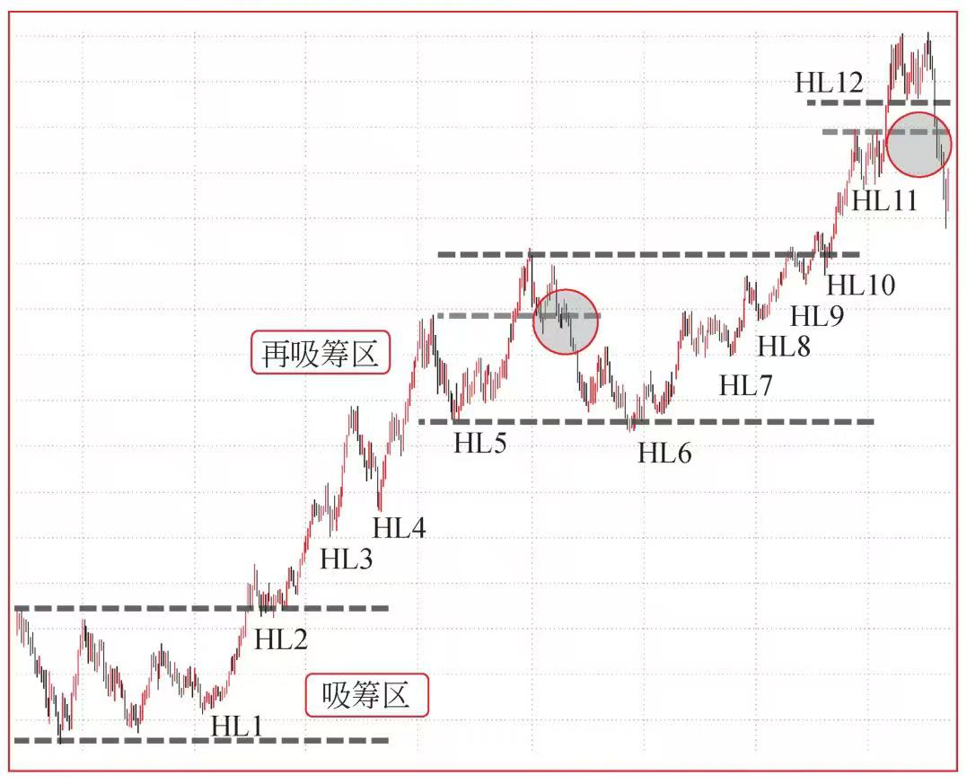 图中的案例是一个两段趋势行情构成的大型趋势,HL1到HL5是第一段趋势,HL6到HL12是第二段趋势,中间衔接了一个回调幅度大,持续时间长的再吸筹区。
