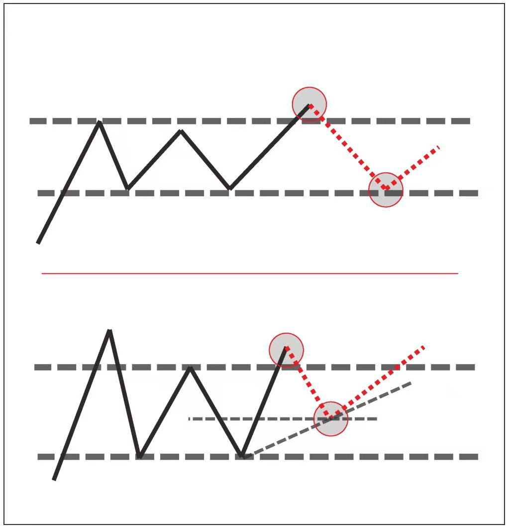 如图1所示,K线交易者研判阻力线附近的假突破,会有红色虚线示意的两种可能的对路走势图。从技术分析的角度,价格在阻力线附近的两次穿越,只能说有假突破的可能。如果随后价格走到图中下侧的两个圆圈,并且红色虚线出现新的逆向运动,才能确认先前的价格行为是对路的假突破。
