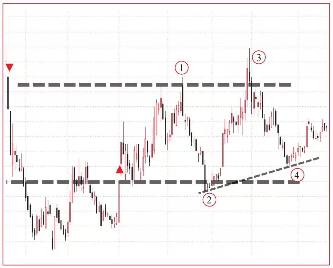 ①是针对阻力线的向上假突破,随后是一段小型下跌趋势,对支撑线形成了假突破。①—②就是对路的走势。③是又一次针对阻力线的向上假突破,随后同样是一段小型下跌趋势,但是并没有触及支撑线,而是形成了更高的底部,②和④的连线是一根上涨趋势线。