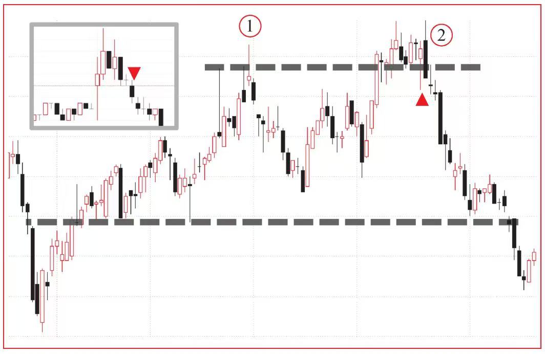 ①是一根长上影的高开Pinbar。当天的价格运动是高开向上突破阻力线,随后价格回落到阻力线下方,完成了假突破的两次穿越。在当天5分钟K线图上,红色三角形对应了一根试图重新站上阻力线的K线,开盘价后的最高价在阻力线上方,表明了一次小型向上运动对阻力线的技术确认。