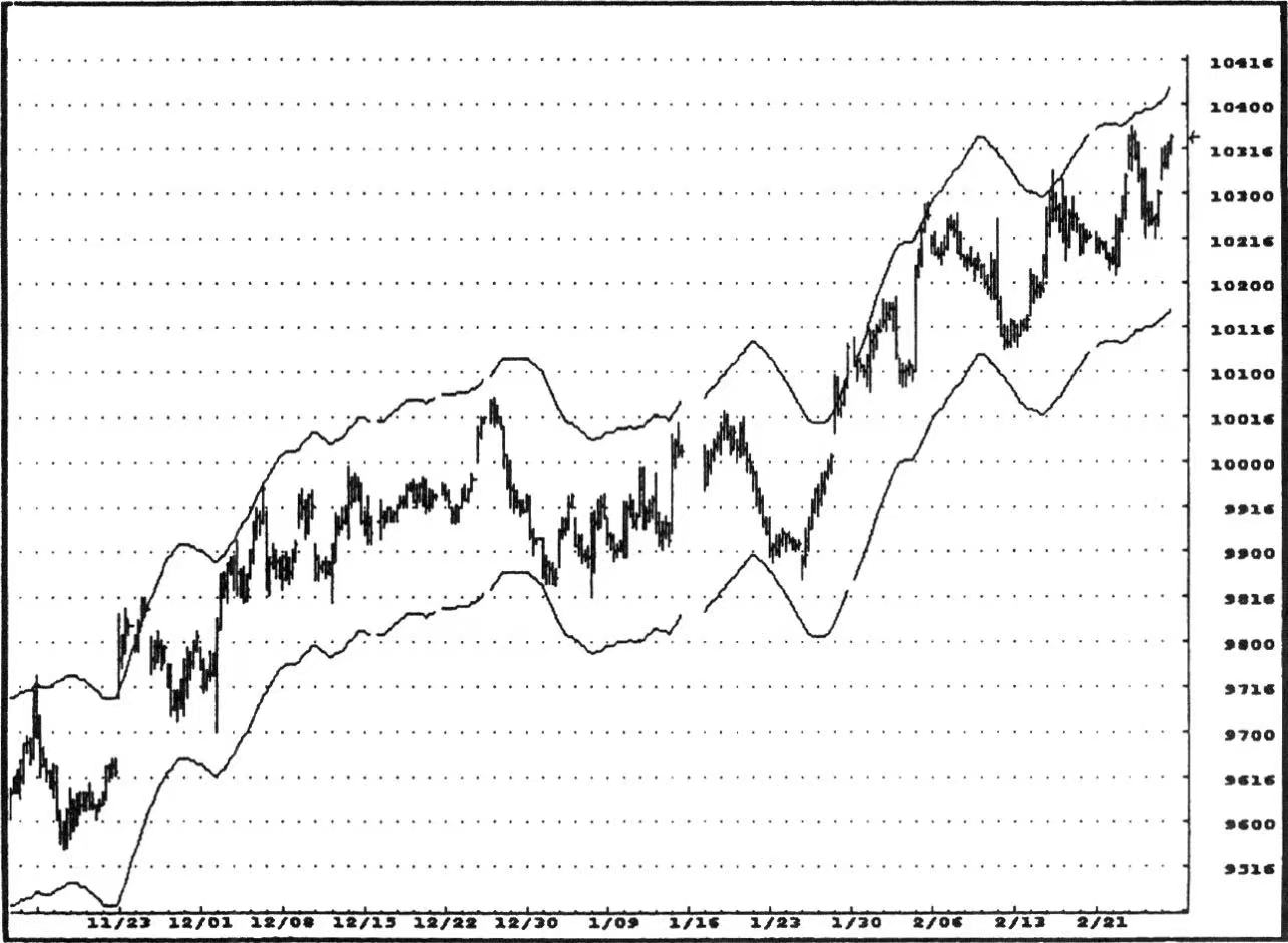 图1说明了运用20日移动平均线和2.5%的比例确认的合约的价格包络带。正如所看到的,价格包络带很好地指示了支撑和阻力价位。同一概念的另一种表达方式是价格包络带指示了超买和超卖的价位。价格包络带不光可以以日为时间间隔,也可以用于其他的时间间隔。例如,图26说明的是与图1所表示的同一个市场的90分钟条形图的1.2%的价格包络带(当然时期要短得多)。