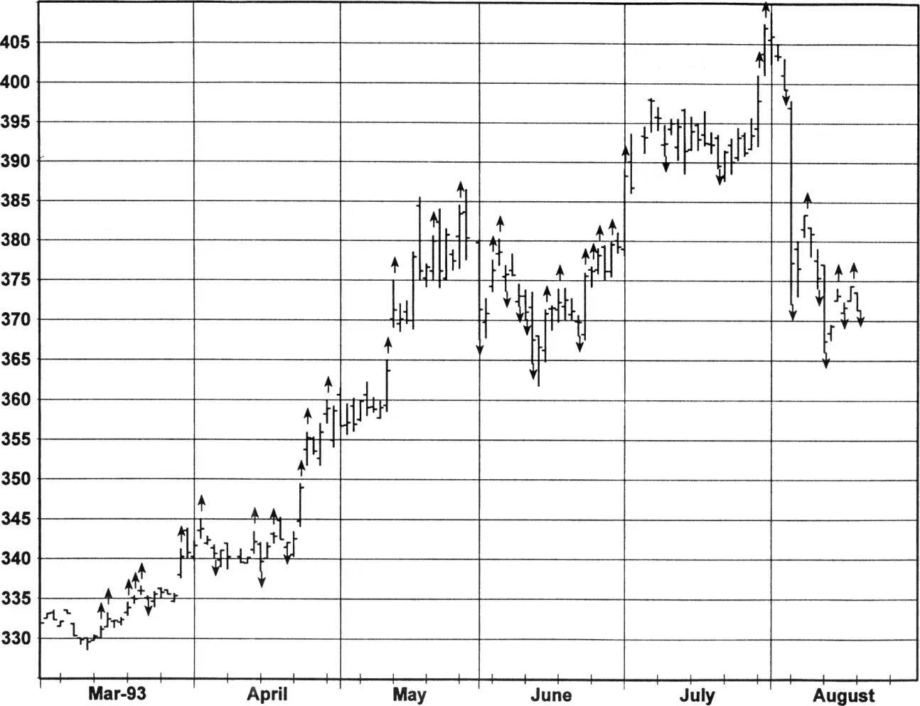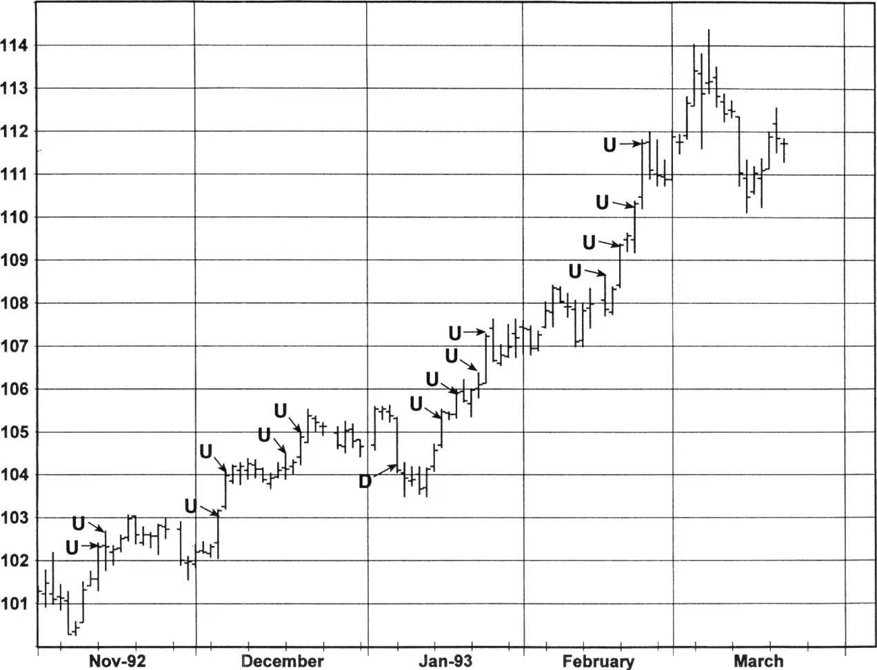 图3提供了单边日的例子(在N=5的基础上)。如图中所见,单边日易于在市场处于单边趋势时出现——名字由此而来。上升单边日的存在,特别是一连串的上升单边日的存在,是市场处于牛市阶段的证据(见图3)。类似地,下降单边日占统治地位是市场处于熊市状态的证据。