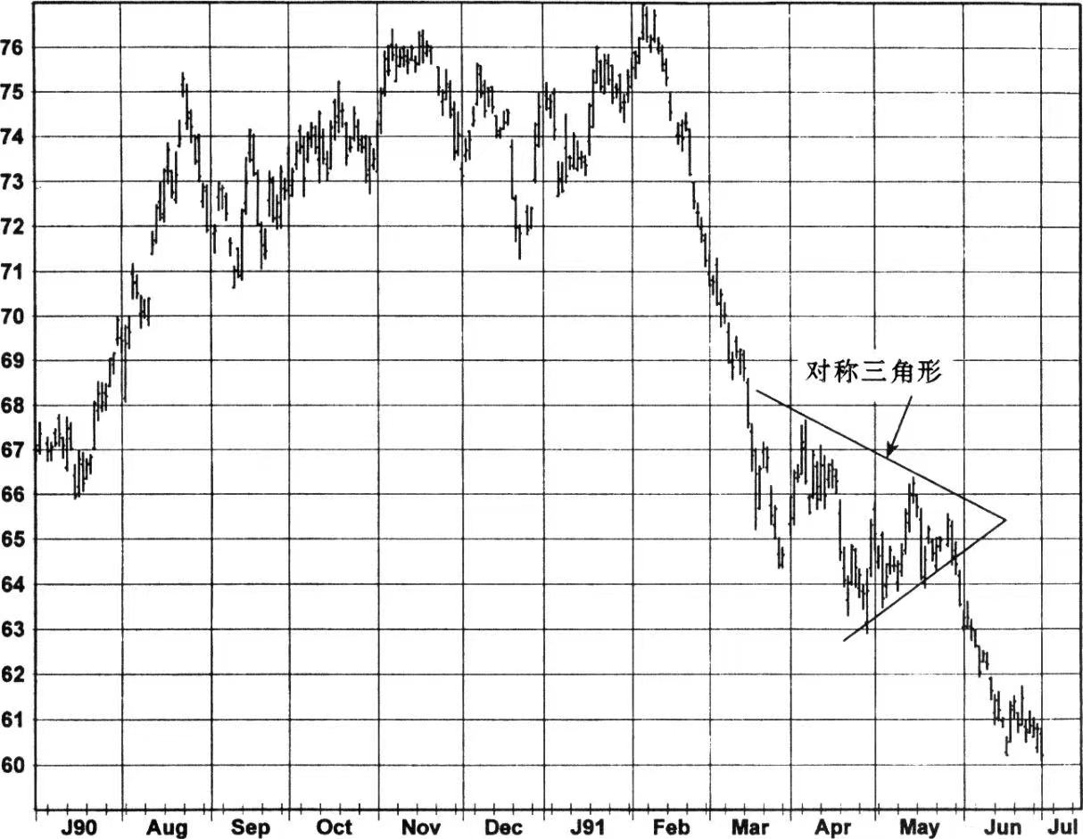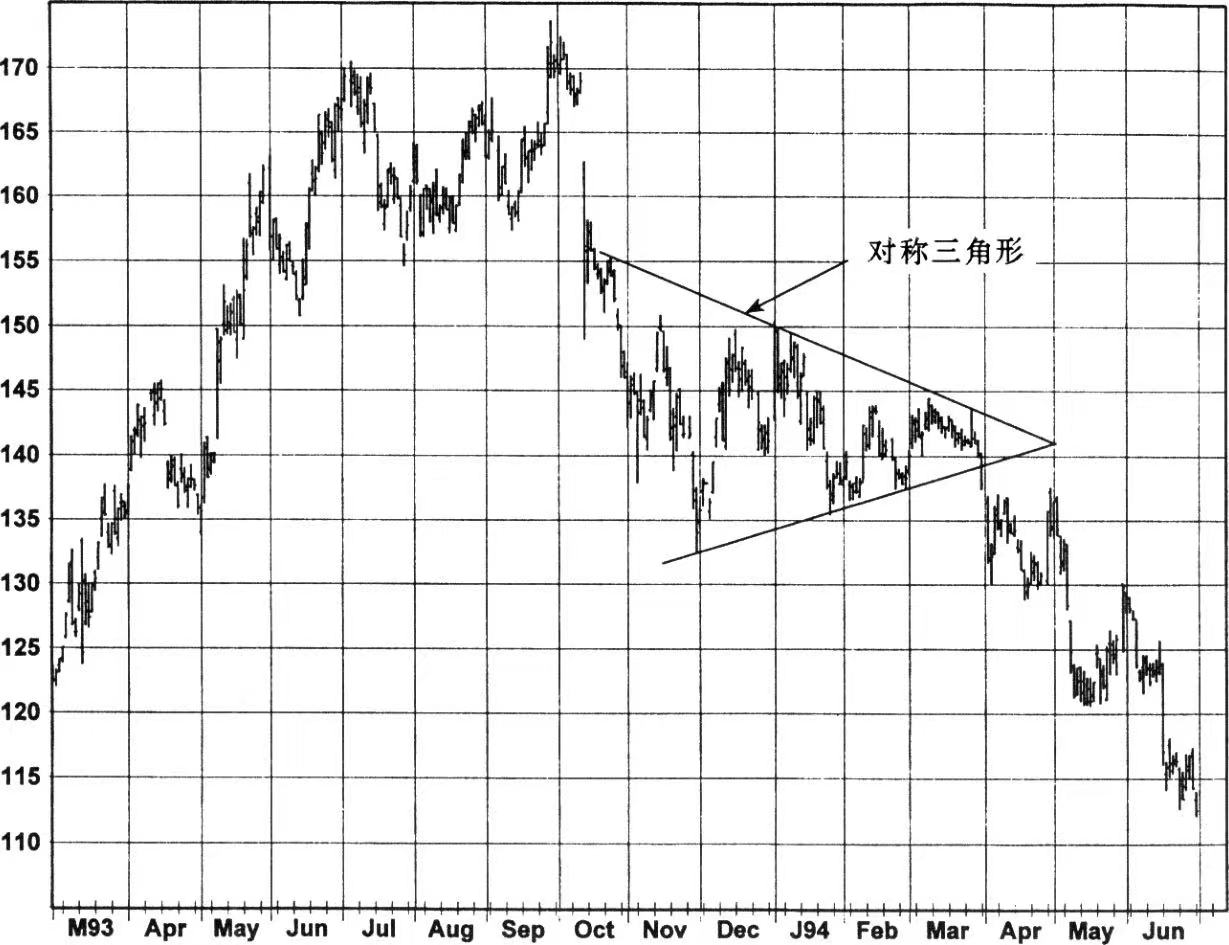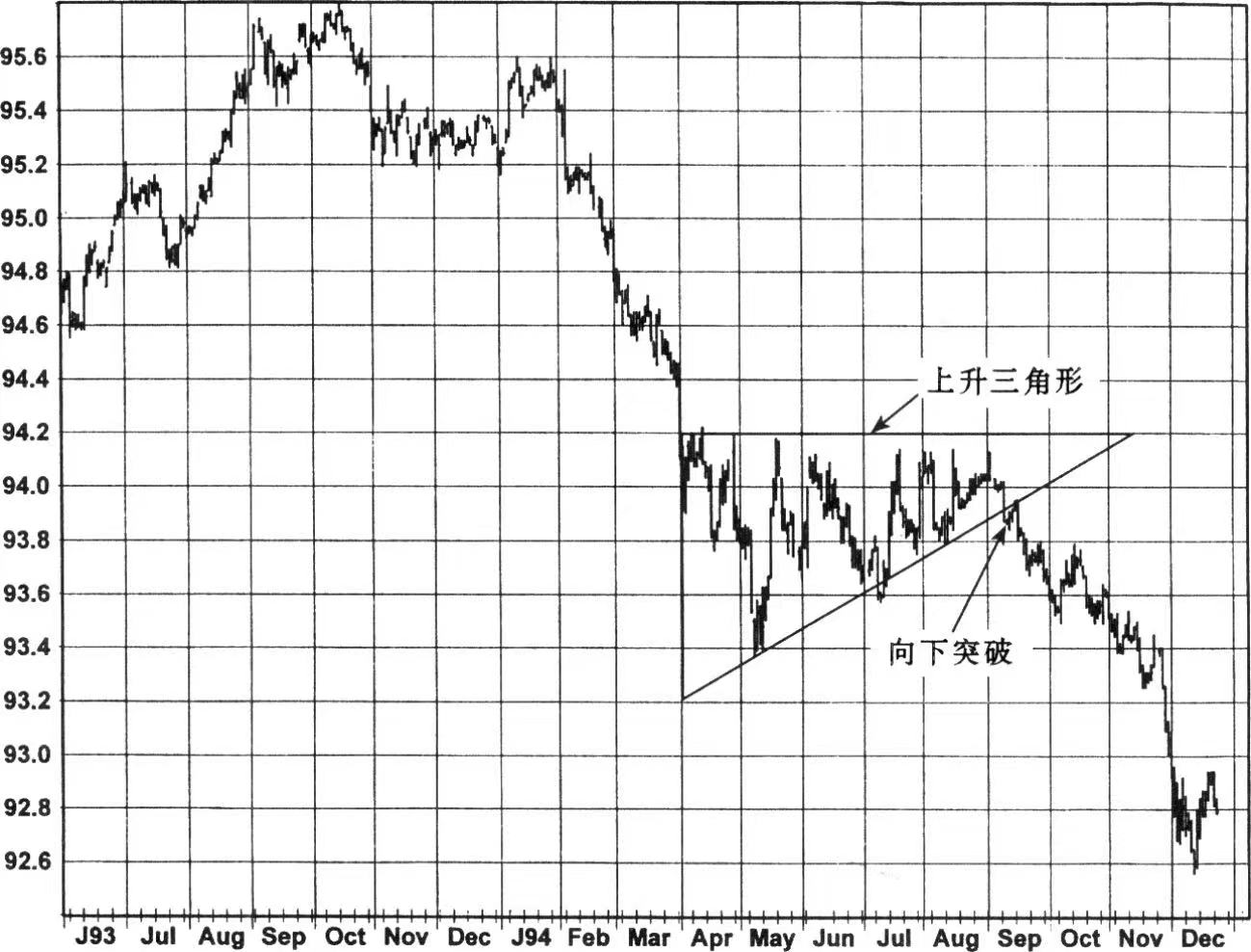 三角形有三种基本类型:对称三角形(见图1和图2),上升三角形(见图3和图4),和下降三角形(见图5和图6)。对称三角形之后的价格走势经常是它形成之前的趋势的继续,如图1和图2所示。传统的图表知识认为趋势会沿非对称三角形的斜边方向发展,如同图3至图6中的情形。然而,三角形的突破方向比三角形的类型更重要。例如,在图7中,尽管1994年4—8月的整理形态是一个上升三角形,但突破出现在下边,随后是一个明显的下降。