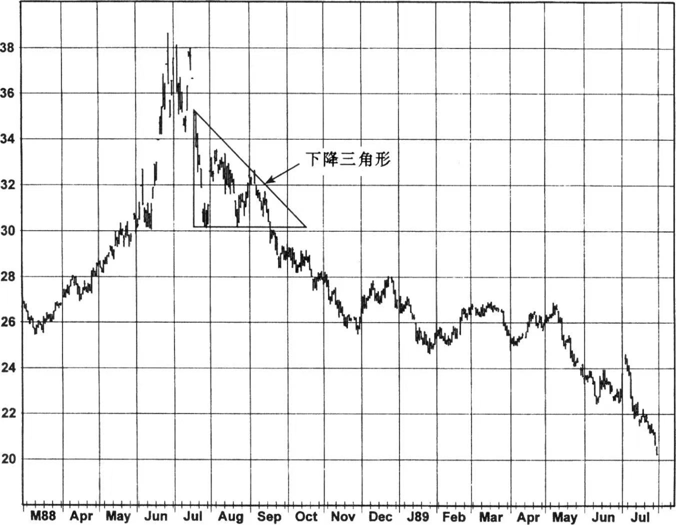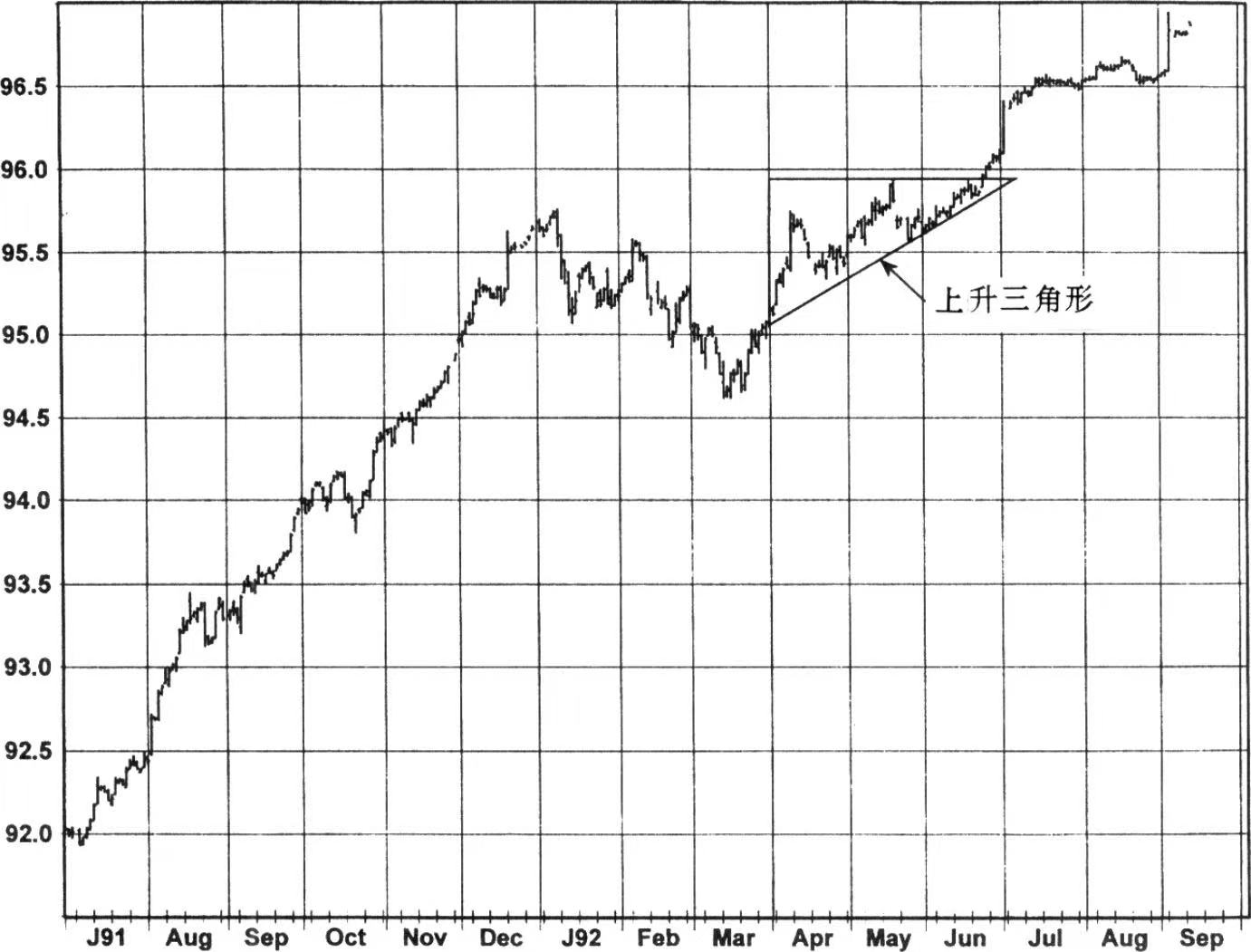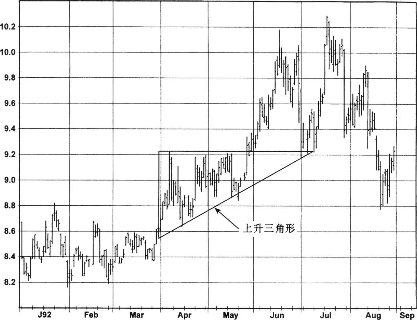 三角形有三种基本类型:对称三角形(见图1和图2),上升三角形(见图3和图4),和下降三角形(见图5和图6)。对称三角形之后的价格走势经常是它形成之前的趋势的继续,如图1和图2所示。传统的图表知识认为趋势会沿非对称三角形的斜边方向发展,如同图3至图6中的情形。然而,三角形的突破方向比三角形的类型更重要。例如,在图7中,尽管1994年4—8月的整理形态是一个上升三角形,但突破出现在下边,随后是一个明显的下降。