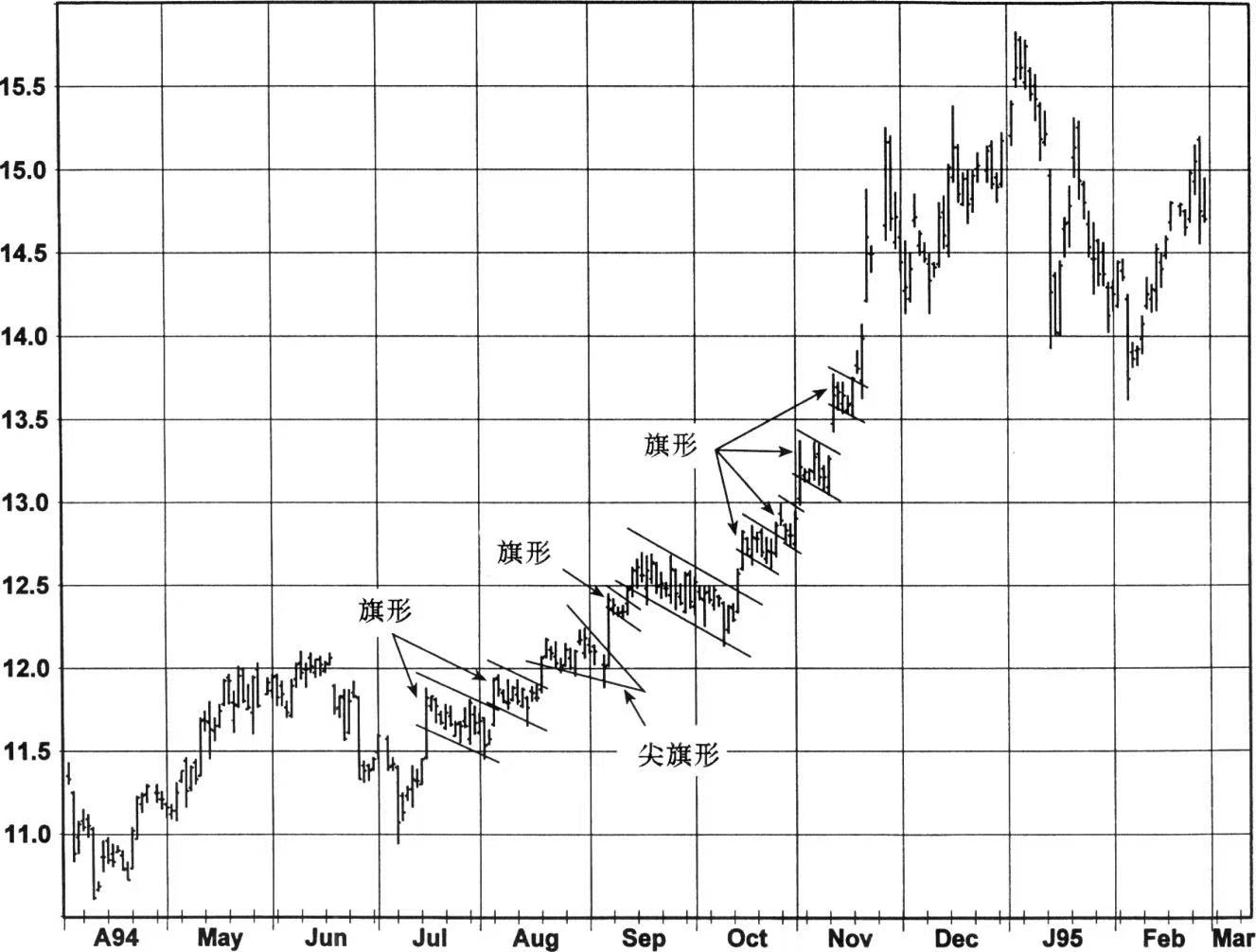 旗形和尖旗形的特征是指向与主趋势相反。图8和图9是相当有代表性的图,它们中的大部分旗形和尖旗形都显示了这一特征。然而,旗形和尖旗形的指向并不是考虑的重点。以我的经验,我还没有发现当旗形和尖旗形的指向与主趋势方向一致时同更为常见的与其方向相反时有任何可靠的重大区别。