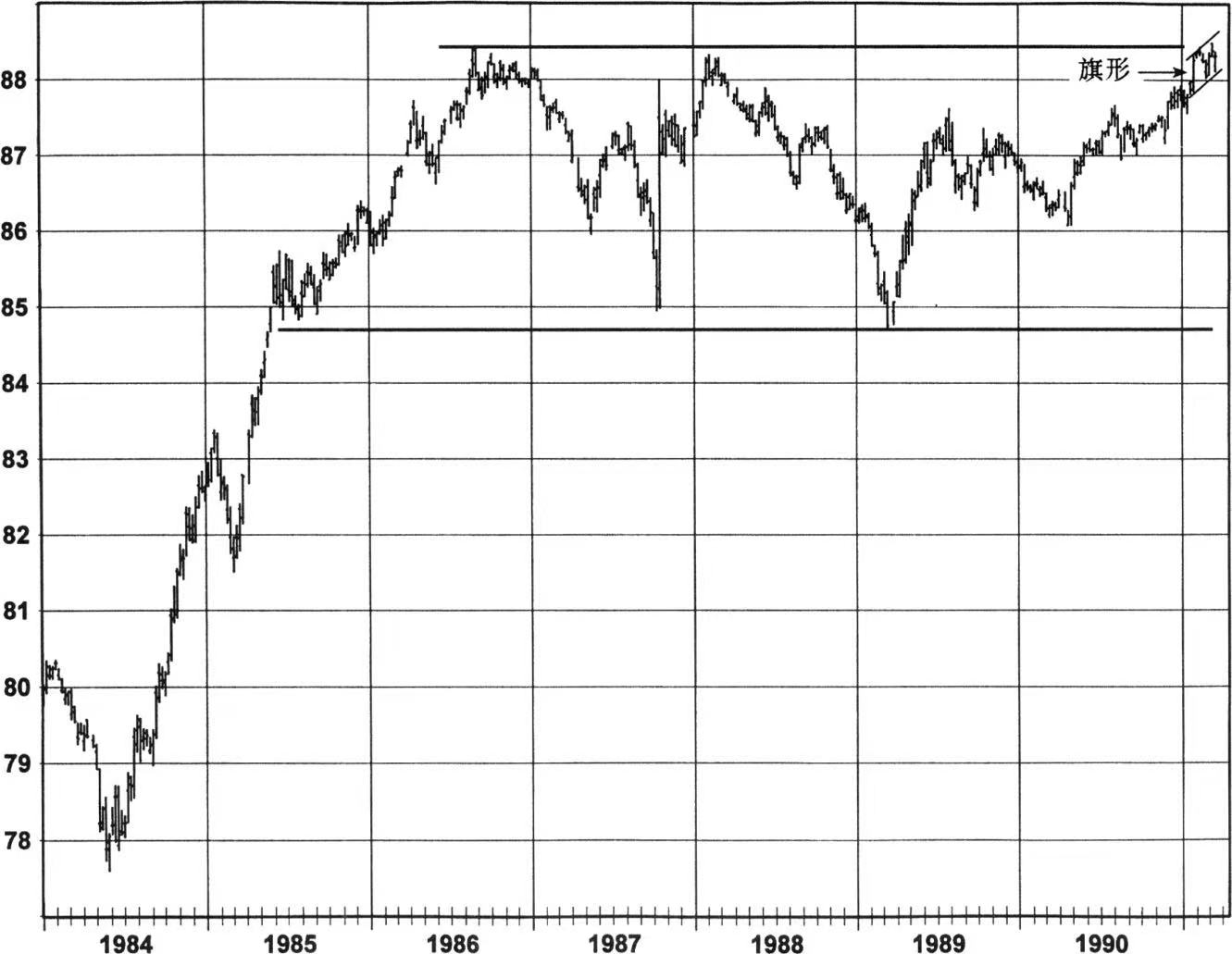 3.图表分析不仅仅只是识别和解释单个形态。成功的图表交易者的标志之一是一种对整个图形的各种组成进行综合的能力。例如,只是把1992年9月欧洲美元市场(见图1)看作盘整区的交易者会把向上和向下的突破同等对待。但是,越有经验的图表分析者也就越能够全面地审视图形,分析人员就会指出市场在长达5年的盘整区的顶部附近形成旗形。这个强劲的长期多头图形会强烈警示反对接受日图中任何明显的卖出信号。所以这种全面的图表分析能够帮助分析人员避开在3月出现的虚假的卖出信号(见图2),并站在多方一边采用更为进取的交易姿态而不是保守的,如果这情形只被看作另一个盘整区的话。