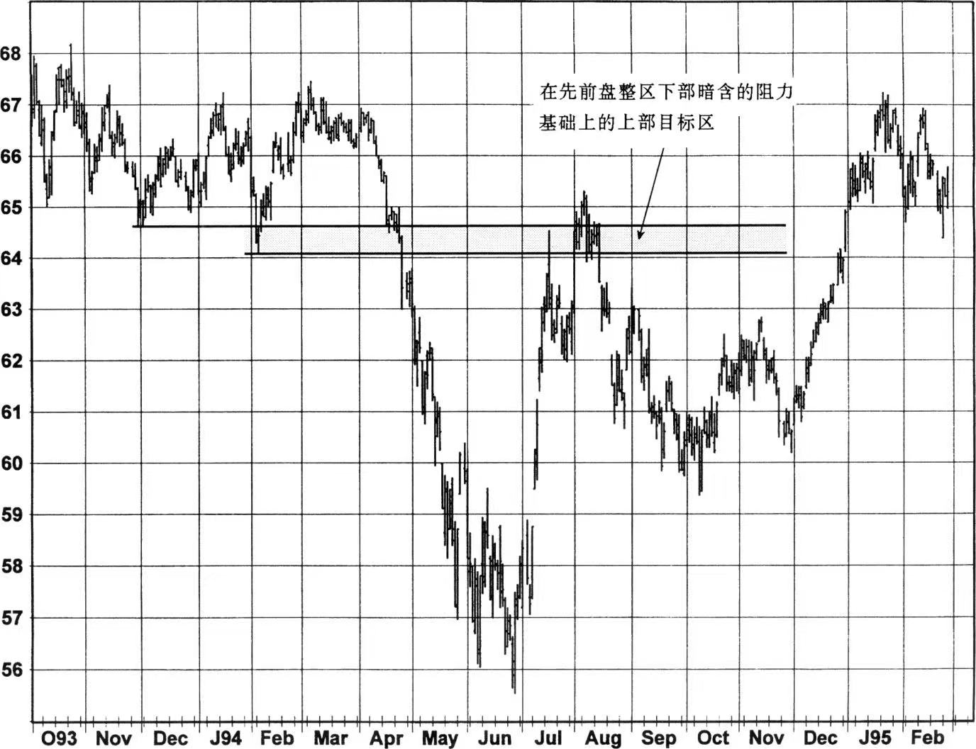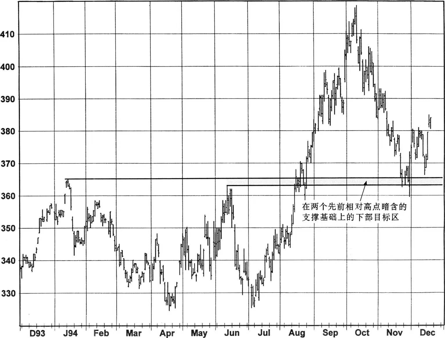 接近支撑线的点为设置空头仓位的初始目标提供了比较合理的选择。例如,图3中标出的目标区域是根据预期前两个相对高点会产生支撑来确认的。相似地,接近阻力线的点可以用来设置多头仓位的初始目标。例如,图4中标出的目标区域是根据前面的延伸的交易区的较低部分所显示的阻力确认的。