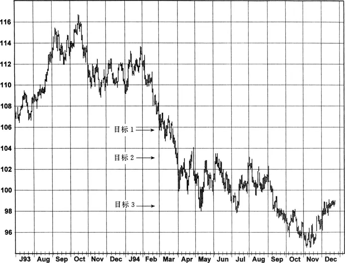 图2说明的是在熊市中如何运用7的准则。熊市中的首次摆动(是用连续期货合约显示的)等于7—23点。根据Sklarew的方针,因为这处于熊市中,我们用第一个到第三个目标(通过乘数1.4, 1.75和2.33求得)。这三个数与最初的价格摆动相乘,从移动中的最高价中减去这个结果,得到下降目标。这些目标在图2中用箭头表示。应注意到,第一个目标比1994年5月的相对低点高一些,而第三个目标只比1994年5月的相对低点稍高。(目标2并不对应任何明显的相对低点)。