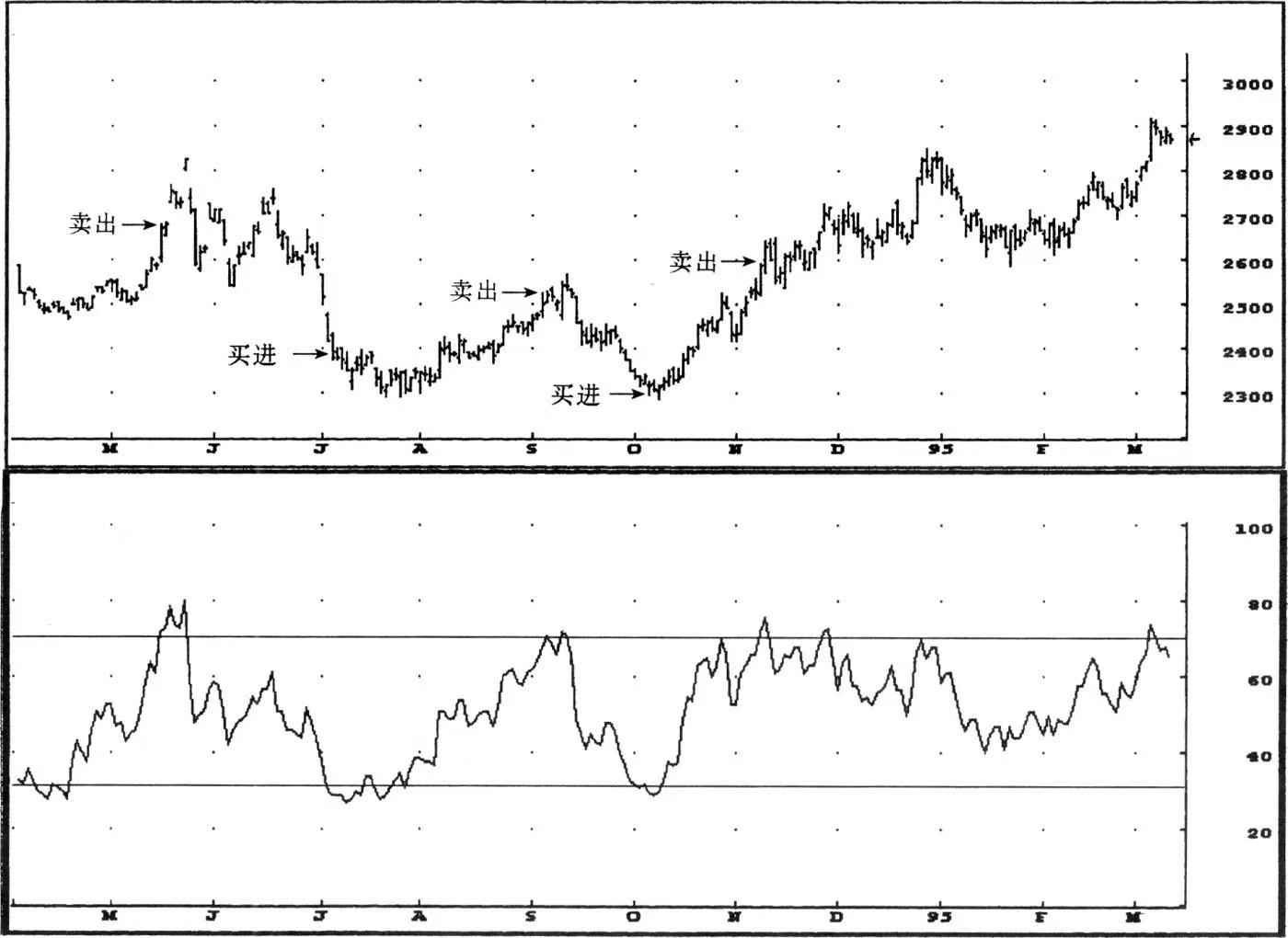 超买/超卖指标是指各种技术性的测量方法,当价格发生过于明显的上升或下降时它们可对其做出反映,所以对回调很敏感。图5说明的是相对强弱指数(RSI),它是一个超买/超卖指标。RSI的值域是0到100。根据标准解释,当超过70时显示超买状态,低于30时显示超卖状态。