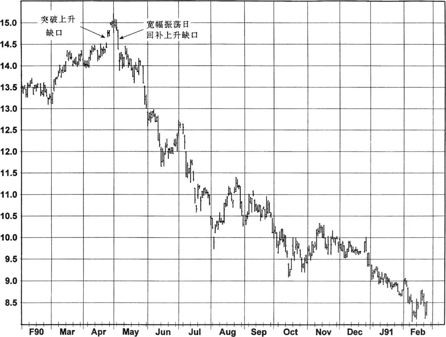 图6中是两个连续的下降缺口回补的例子。尽管价格运动准确地表现出一个主要底部已形成,但要注意价格持续上升前的第一次回调。其中暗含着这样的教训:那就是即使某一失败信号的指示有效,在预期的价格运动出现之前也可能首先经历一个价格修正。在下降缺口的例子中,只要市场不在缺口以下收盘,失败信号可以被认为仍是有效的,如果有不止一个缺口,则是指不在最低的缺口以下收盘。(相类似地,在上升缺口的情况下,假如市场不在缺口以上收盘,已失败的信号可以被认为仍是有效的,如果有不止一个缺口,则是指不在最高的缺口以上收盘。)