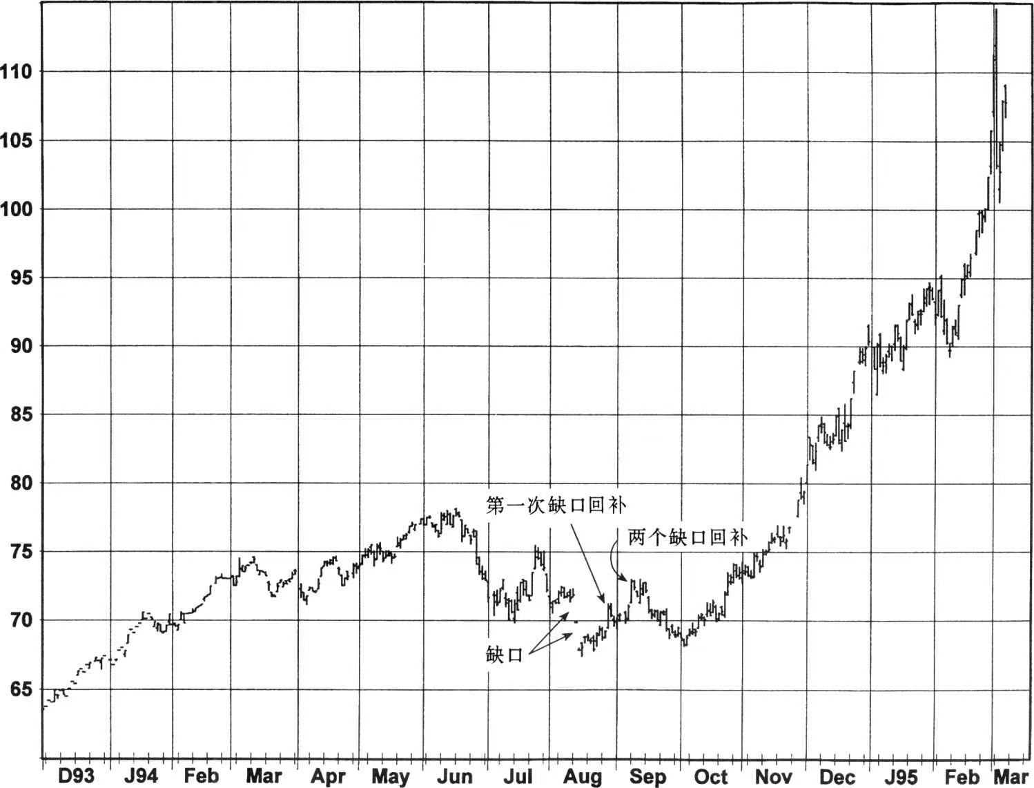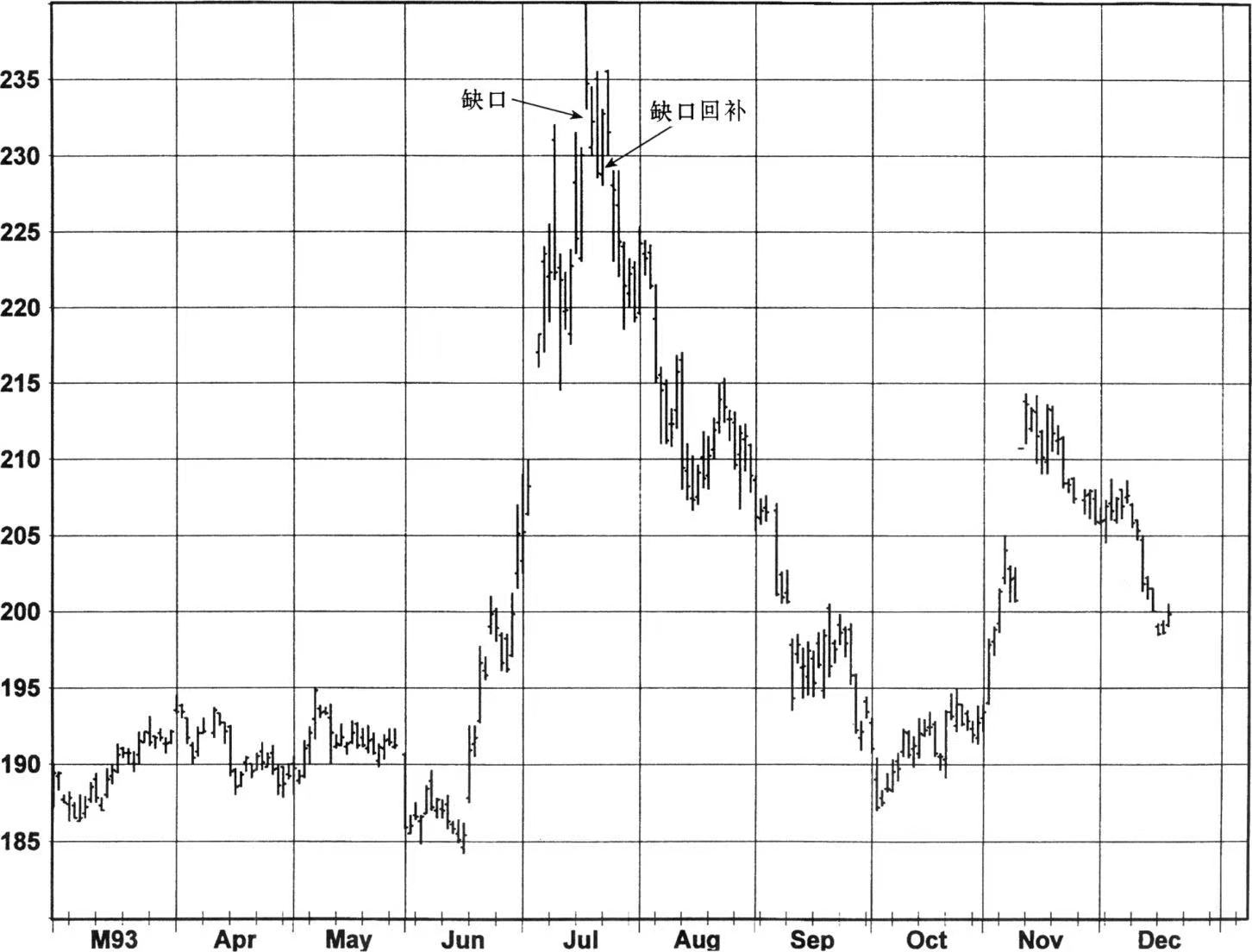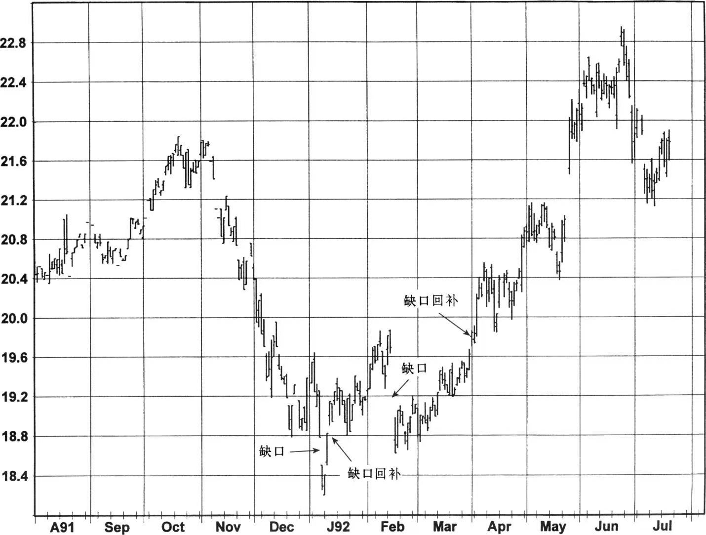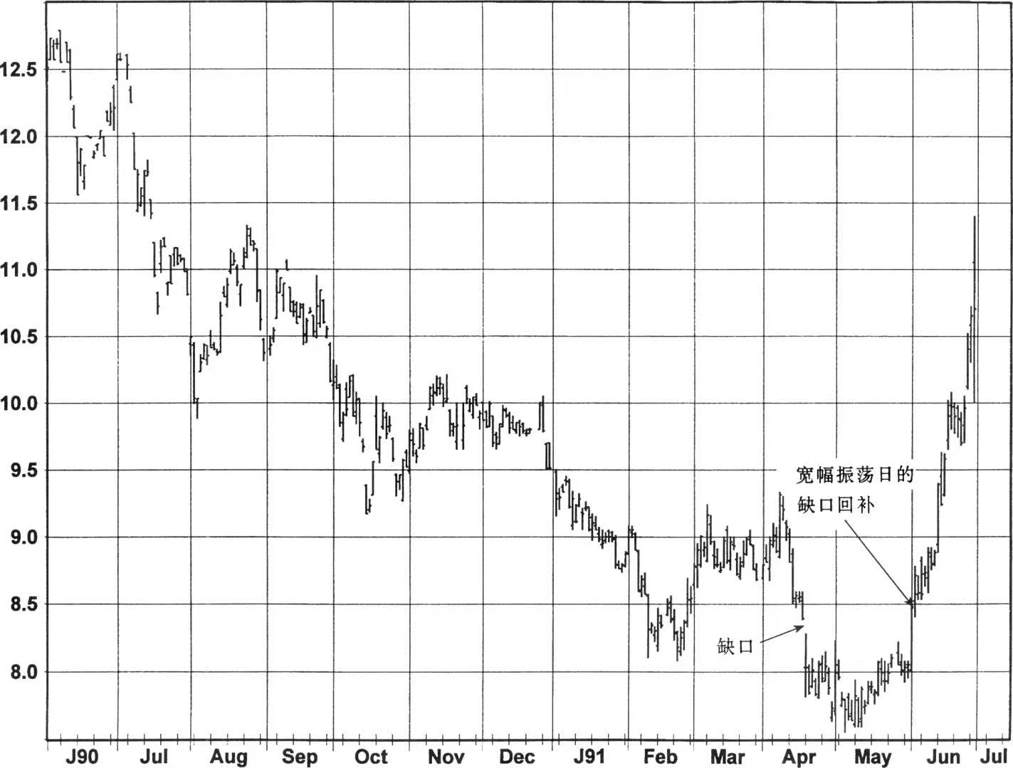 图4至图6提供了一些下降缺口回补的例子。在图4中,处于一个新低的宽度较大的下降缺口在两天后就回补了(最低点出现之后一天),较早地为最终证明是非常主要的趋势反转提供了信号(另一个下降缺口回补发生在三个月之后)。在图5中,回补缺口的那个交易日本身就是一个宽幅振荡日,这在单独的一段交易时间里有效地提供了强烈的双重信号。正如所看到的,这个结合信号之后随之出现急剧的回升。