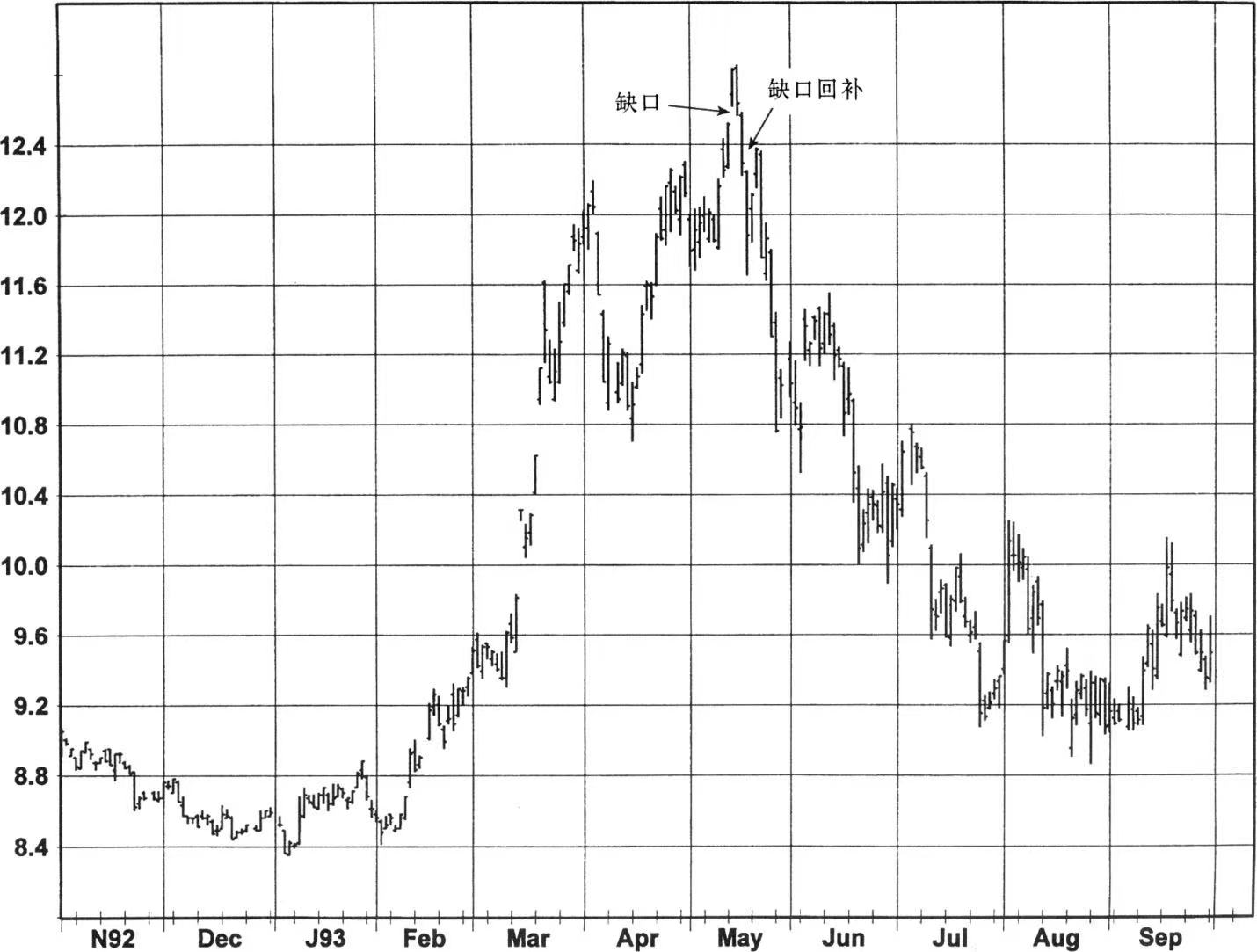 尽管当日内价格达到缺口前的那天最高价时一般就可以认为是缺口回补了(在下降缺口的情况下是最低价),我更愿意采取一种更加严格的定义,即要求收盘价低于(在下降缺口的情况下是高于)缺口日的前一天的收盘价。这种更严格的定义在无法最终断定前面的缺口是否是失败信号时将减少得出“是”的结论的次数,代价是当结论正确时,指示稍微滞后了一些。