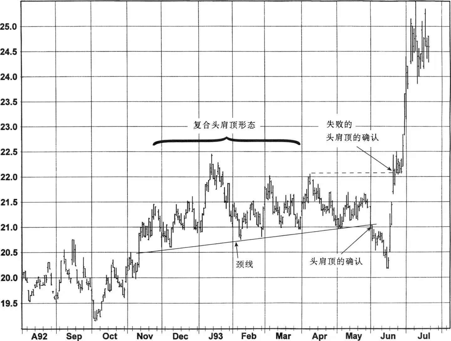 双顶和双底形态的突破能够提供很好的信号,但相对比较罕见。涉及头肩形的失败信号更为普遍,并常常提供出色的交易指示。尽管选择什么条件来确认一个失败的头肩形具有一些随意性,我愿意用市场回撤到高于(或低于)最近的肩部的准则。如在图4中,反弹到7月份的肩部之上代表了对一个失败的头肩顶形态的确认。在这种情形下,确认条件之后会紧跟着一个急剧的价格上涨。但常常是,市场可能首先在突破肩部之后下降,尽管确信大幅度上涨最终会出现(例如图5和图6中所示)。图7是一个涉及一个复合头肩顶形态的失败信号的例子(复合头肩形是指在头的任何一边有两个或两个以上的肩部的形态)。
