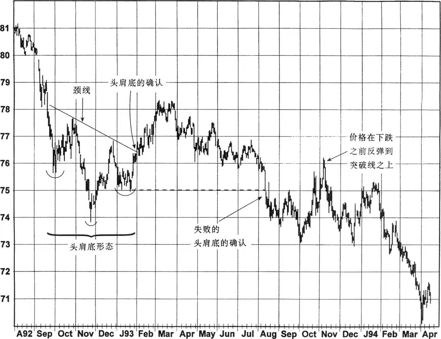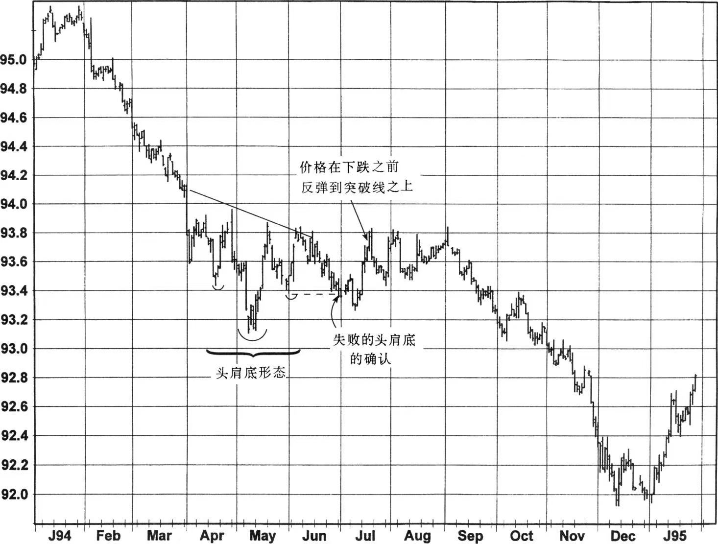 图7至图10显示的是失败的头肩底形态的例子。与头肩顶的例子相类似,较近的肩部的向下突破被作为是失败信号的确认条件。应注意到,在这三个例子中,在确认信号出现后先是有个反弹然后再最终急剧下降。正如前面的例子所表明的,在根据一个失败的头肩形的确认建仓之前,等待回撤通常会使交易者受益。缺点是在没有回撤或回撤较小的情况下,这种策略会导致失去非常有利的交易机会(如图4和图8的例子)。