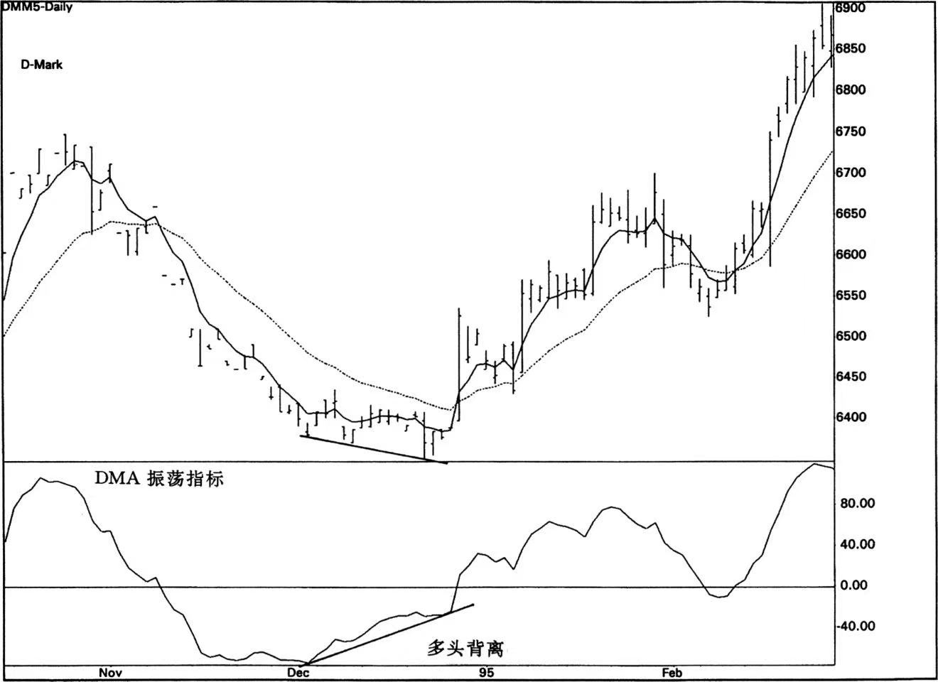 注:1994年11月在50日EMA上方收盘,确认了DMA振荡指标的多头背离信号