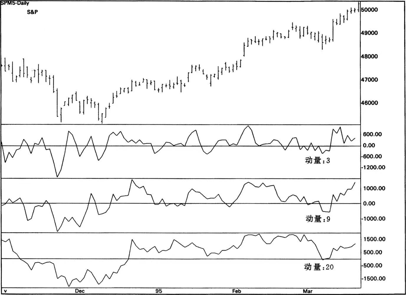 注:动量和价格变动率的计算方法不同,但得出了近似的曲线。两者都是测量价格变化速率的简单的逻辑方法。注意两个指数的竖轴的缩放比例是不同的,但这不影响它们的解释