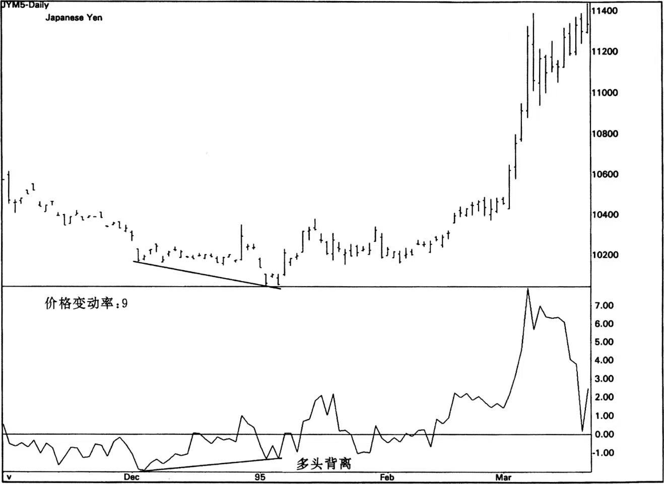 注:1995年日元降至更低的低点,但9天的价格变动率却是一个高一些的低点。ROC不能突破它前边的低点,这是可能出现趋势变化的早期警告信号