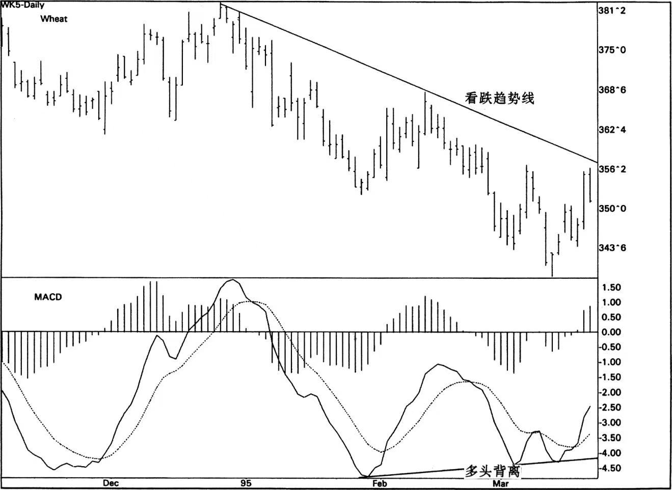 注:尽管在小麦新的低点和MACD较高的低点之间出现多头背离,建议在市场突破看跌趋势线之前,不要进多仓