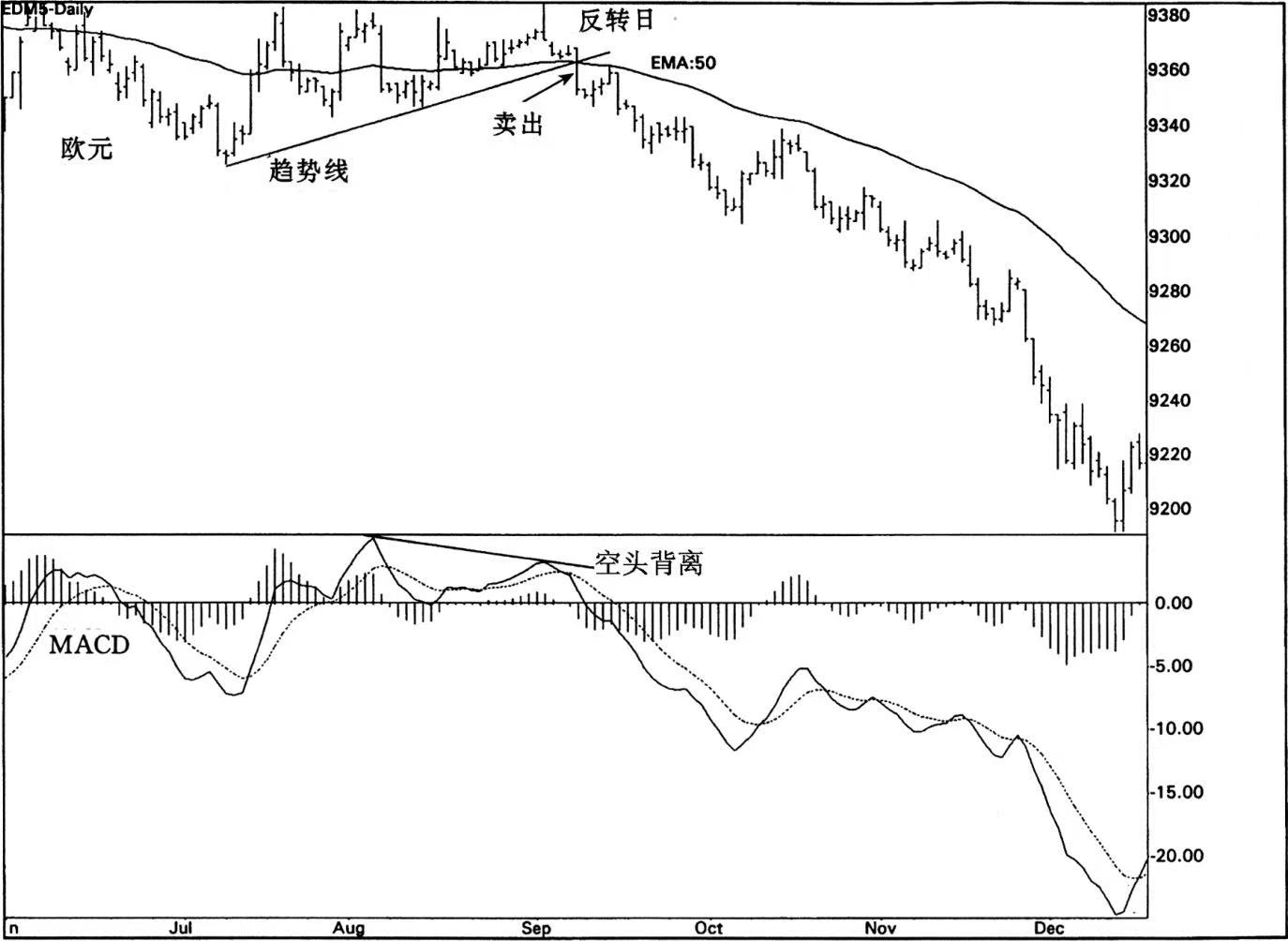 注:在空头背离形势下,欧洲美元形成反转日,突破看涨趋势线,以低于EMA的价格收盘。这种信号组合确认了MACD的卖出信号,预示(下降)概率很高。图中标出的卖出点同价格运动的确认(即,趋势线的突破和低于EMA的收盘)相对应
