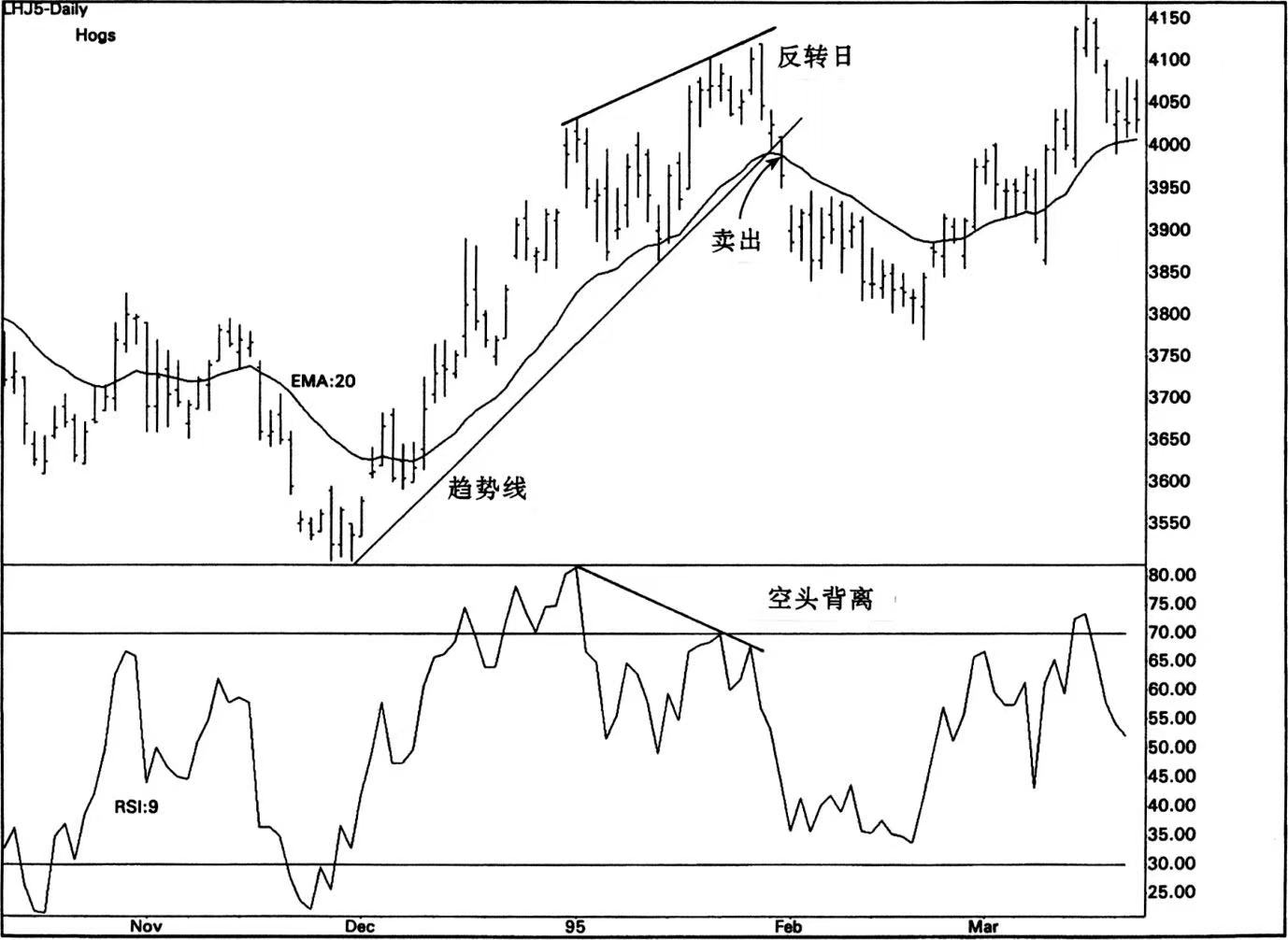 注:振荡指标—背离信号即使得到跟踪趋势的确认,也并不总是产生美妙的结果。空头背离,反转日,趋势线和EMA下方的收盘形成之后,这个市场交易只在低点持续了13天,然后开始回升至新的高点