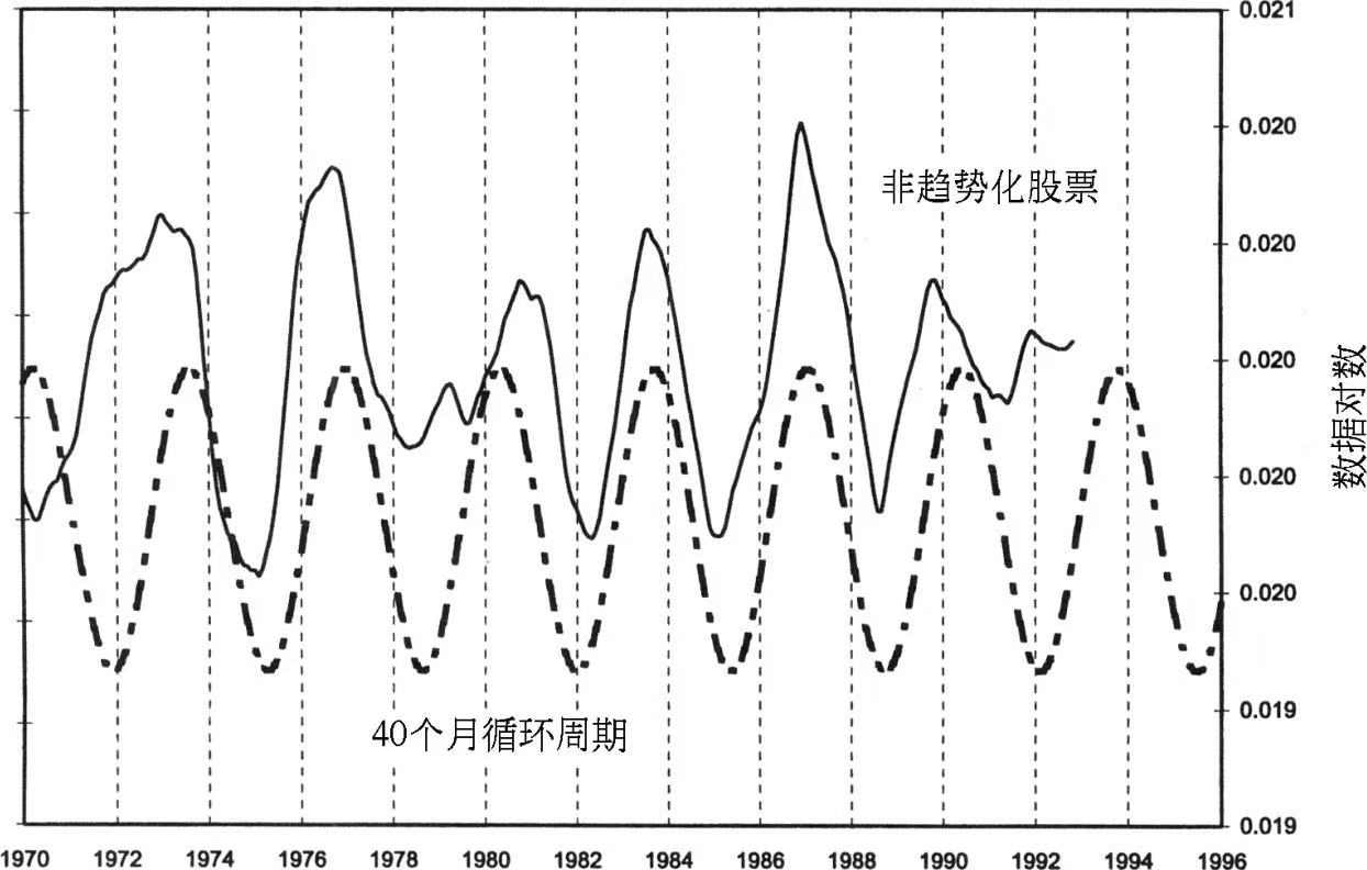 这些问题的正反两方都有真诚的并且受过教育的支持者,也许真理存在于中间位置:也许循环周期并不像循环周期狂热者说得那么多,当然也不像反对循环周期的研究者们宣称的那么少。然而,循环周期存在于许多经济系列中(如不同的价格数据)的数字证据却是十分有力的。仅举一例,一项股票市场的分析表明,经过统计测验指示出的一个40个月(见图2)循环周期,出于偶然而形成的概率只有2/10000。40年前,没有人相信在科学和经济中存在循环周期。从那时起,模式重复出现的证据一直在增加。