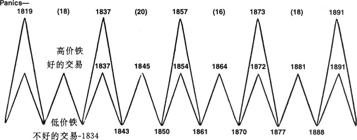 19世纪70年代,英国的W.斯坦利·杰文森(W.Stanley Jeavons)和美国俄亥俄州的农民赛缪尔·贝纳(Samuel Benner)都将各自国家的经济数据同太阳黑子的记录相比较,把经济数据具有阶段性的想法进一步发展。1875年,Benner写出了他的现已闻名于世的《贝纳预言:期货价格的上升和下降》。他也说他的循环周期得自于太阳活动。贝纳于1895年出版了一个有趣的图表,预言了经济变化(见图3)。大约同时,克莱门特·朱各勒(Clement Juglar)发现了利息率和经济之间的10—12年循环周期。现在,这一循环周期已用他的名字命名。