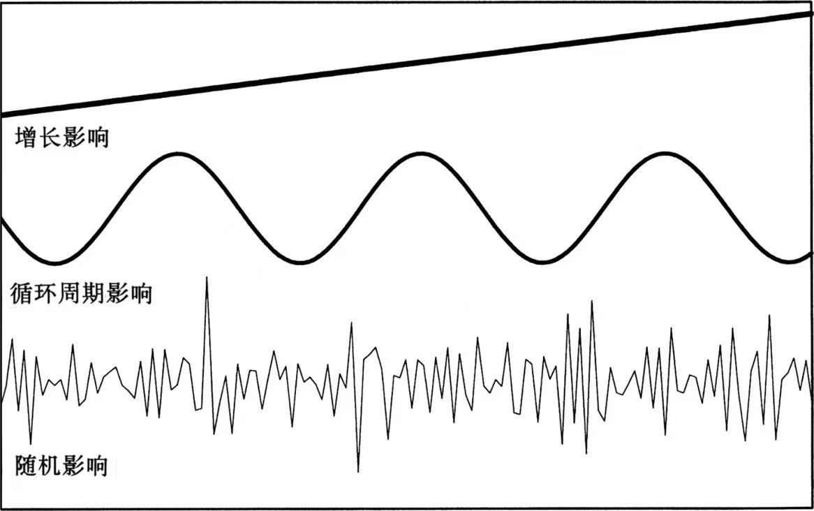 任何一数据序列都可被分为三个组成部分:(1)增长影响;(2)循环周期影响;(3)随机影响(见图4)。循环周期分析涉及的是在数据中发现循环周期或者发现重复模式。