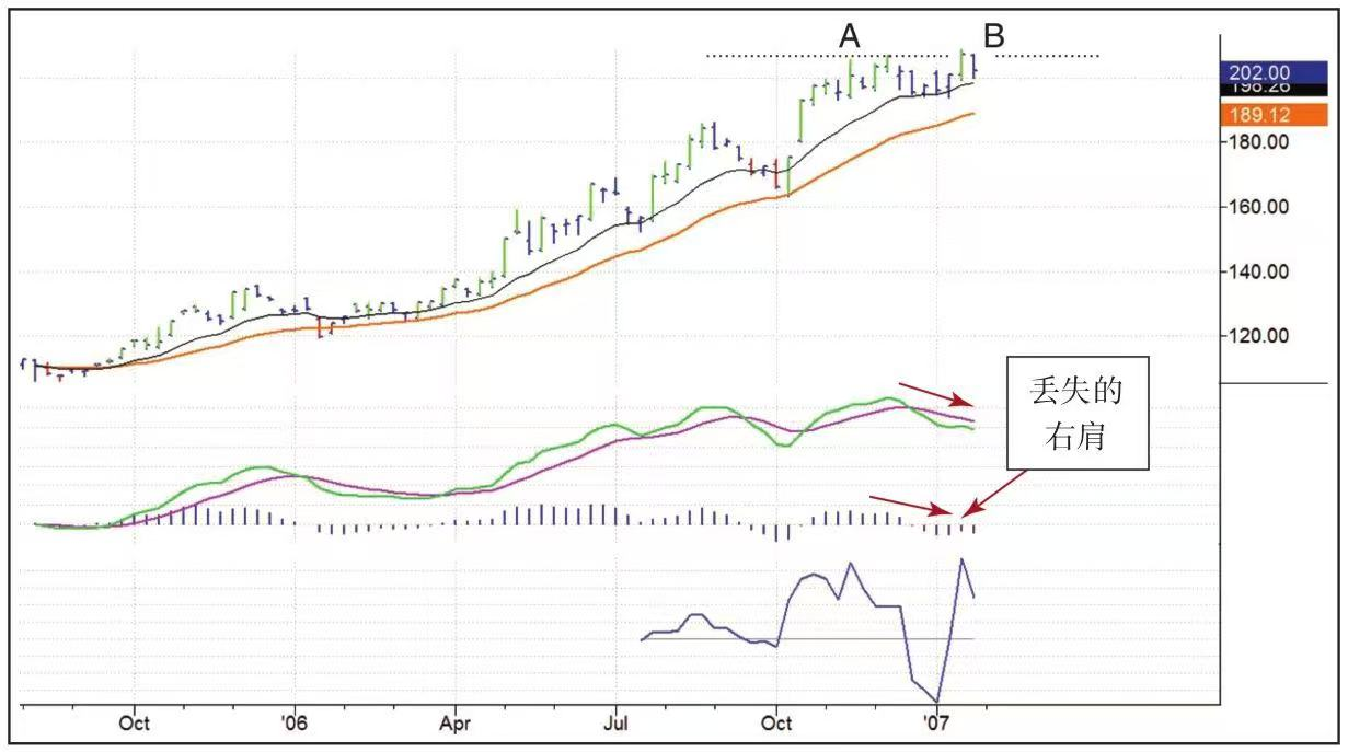 橘汁期货周线图创新高失败出现假突破,同时伴随着顶背离,也就是技术分析中最具吸引力的模式。B点时的橘汁期货价格虽然高于A点,但是没能站上A点,然后又跌回震荡区间。MACD线顶背离,MACD柱出现“丢失的右肩”(“丢失的右肩”这个词是Spike集团的杰基·帕特森发明的,事实上他使用了一个更有感情色彩的词汇,在这里我弱化了感情色彩)。