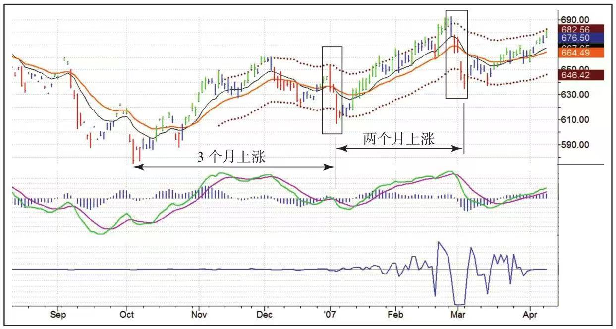 明智的交易者看着同期价格的日线图(见图2)并注意到价格已经上涨了一个半月,价格也已经涨了42美元。他知道如果就此买入必须设置止损,但问题是止损位特别难以设定。当然,在这种情况下使用止损反转指令是可取的。虽然我不是很喜欢这类指令,但对于缓慢上升的行情来说这确实有意义,这个指令会让你结束多单时反手做空。