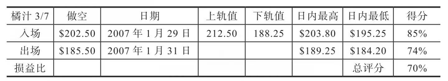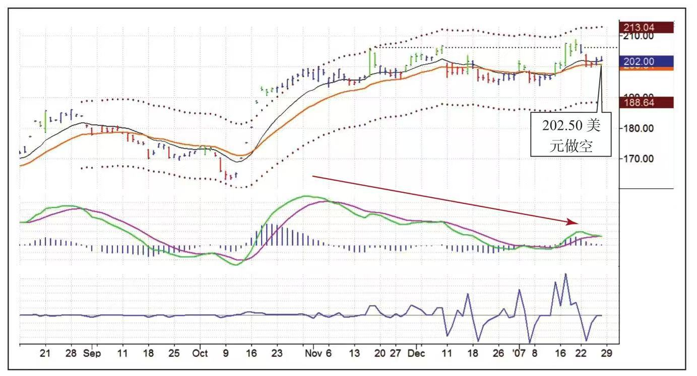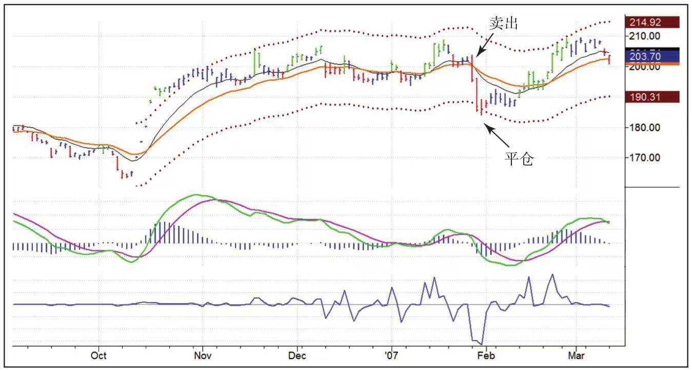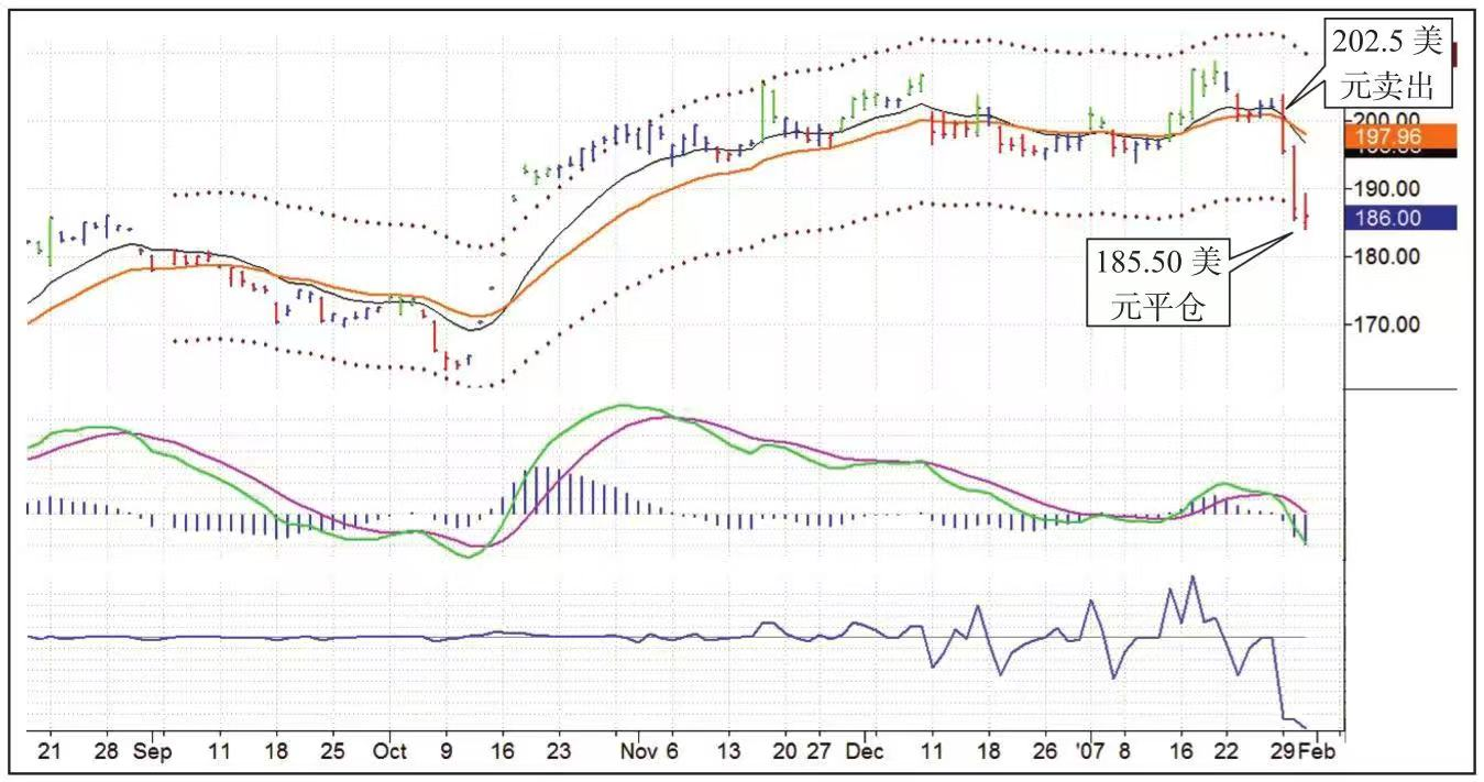当日线图表中价格跌到下轨价之下时,我平仓出局,交易在两天之内结束。可能下跌还会继续,但既然盈利目标已经达到,就没有理由再继续持有了。