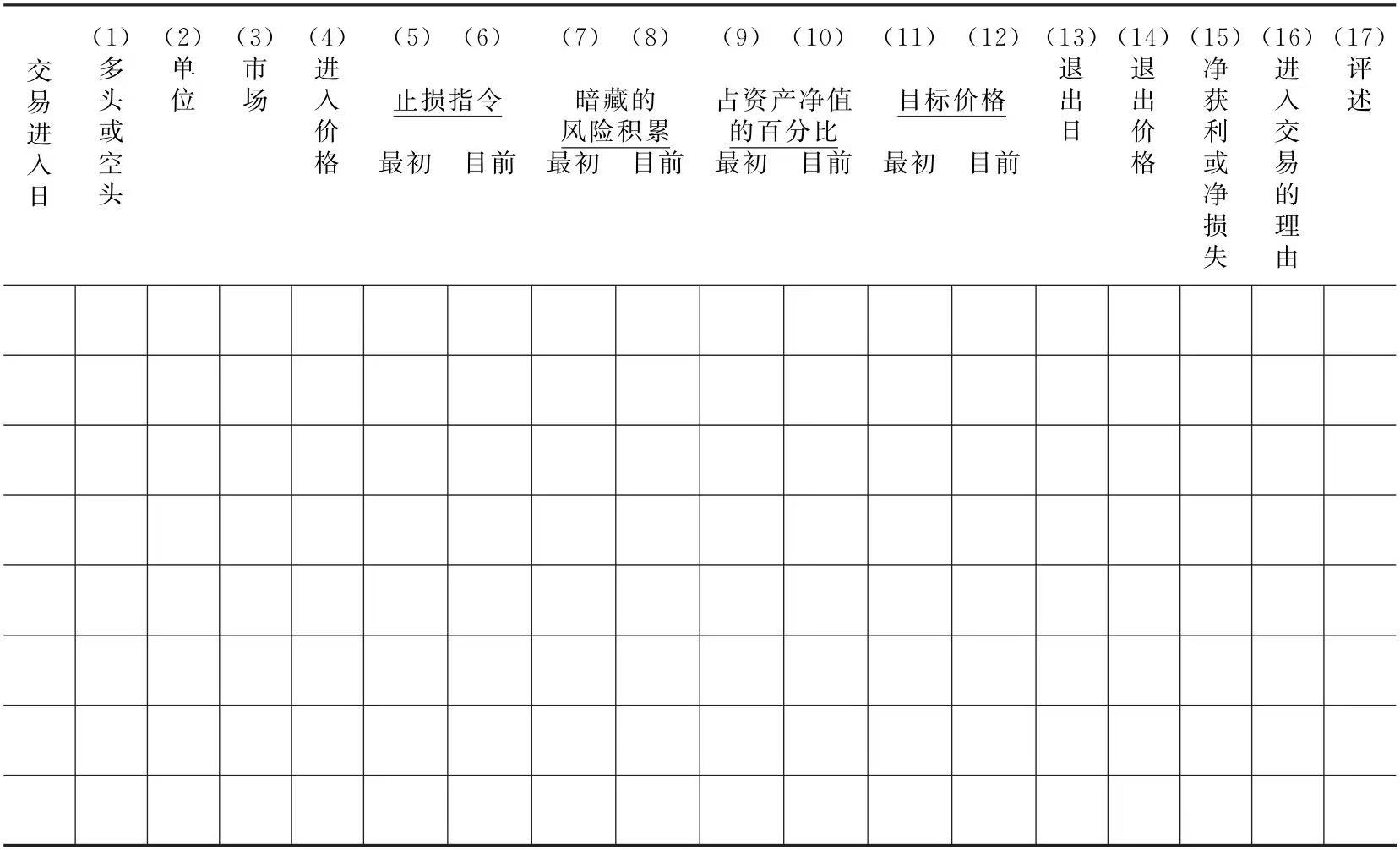 第7—10列概括的是未平仓仓位中蕴涵的风险。为所有的未平仓仓位列出这几项,交易者可以评估她目前的总风险——在控制风险和决定是否建新的仓位方面是至关重要的信息。单凭经验来看,所有未平仓仓位中蕴涵的总风险不应该超过总账户资产净值的25%—35%。(假定在任何给定仓位的最大风险限制在资产净值的2%,那么直到至少在13个市场存在未平仓仓位,才会有以上的限制。)